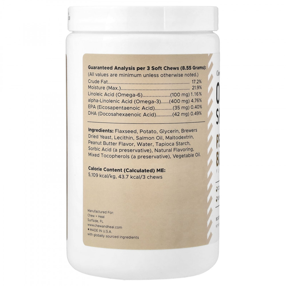 Кожа и шерсть вашего щенка будут иметь потрясающий вид, если вы дадите ему добавку Chew + Heal с арахисовым маслом для здоровья кожи и шерсти. Эта пищевая добавка, изготовленная из жира лосося, льняного масла и лецитина, насыщена витаминами, минералами, жирными кислотами и антиоксидантами, необходимыми вашему приятелю для поддержания роскошной шерсти и здоровья кожи. Кроме того, формула без курицы и говядины помогает предотвратить облысение, уменьшает чрезмерное выпадение и увлажняет сухие и ломкие волосы. Невероятный вкус арахисовой пасты непременно понравится вам!