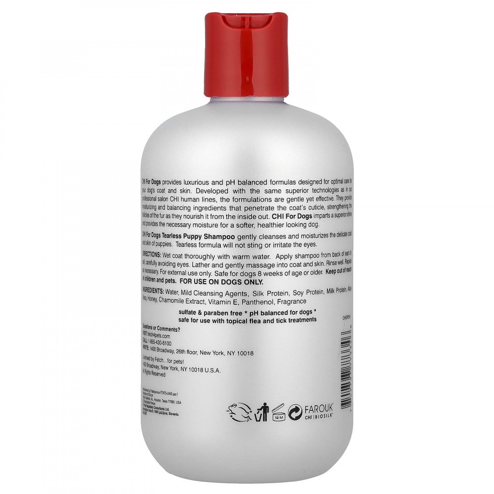Шампунь без слез от CHI For Dogs для щенков бережно очищает и увлажняет нежную шерсть и кожу щенков. Средство не вызывает жжения и раздражения глаз.