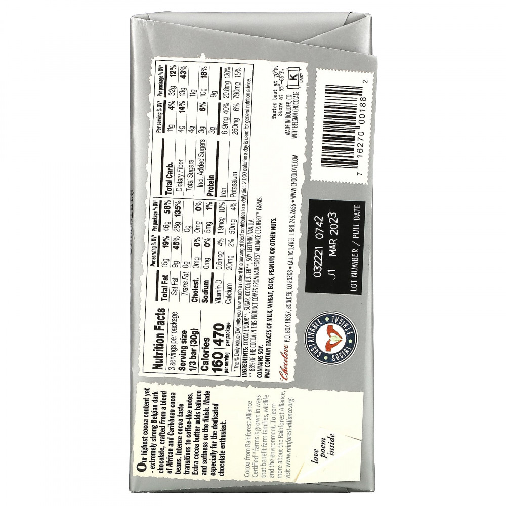 Наш самый высокий уровень содержания какао — чрезвычайно крепкий бельгийский темный шоколад, созданный из смеси какао-бобов из Африки и стран Карибского бассейна. Интенсивный вкус какао сменяется кофейными нотками. Дополнительное количество какао-масла добавляет сбалансированности и мягкости. Создано специально для истинных поклонников шоколада.