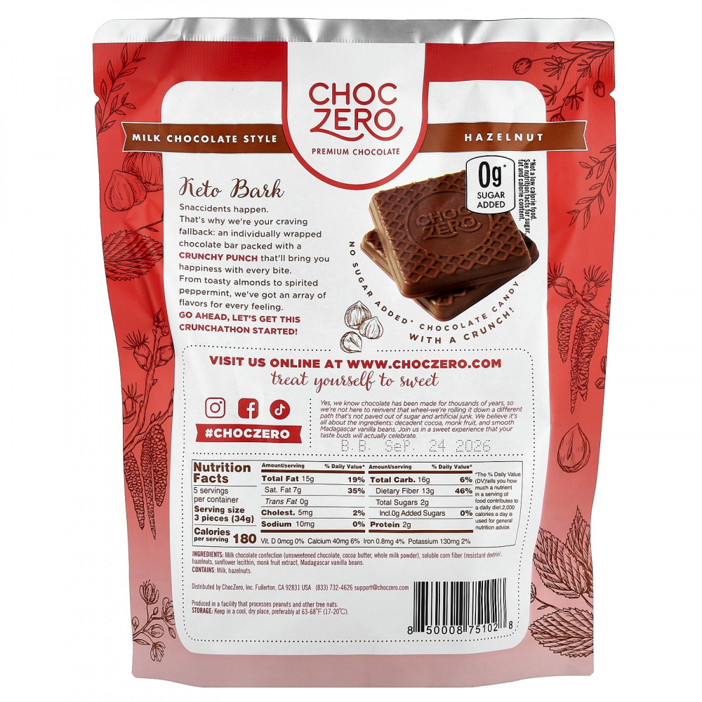 Конфеты из молочного шоколада (горький шоколад, какао-масло, цельное сухое молоко), растворимая кукурузная клетчатка (устойчивый декстрин), фундук, Лецитин подсолнечника, Экстракт архата, стручки мадагаскарской ванили.