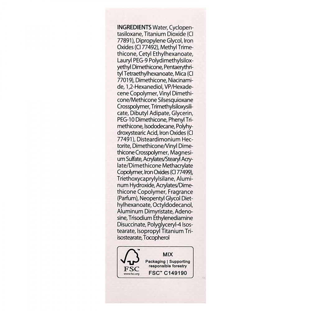 Вода, циклопентасилоксан, диоксид титана (CI 77891), дипропиленгликоль, оксиды железа (CI 77492), метилтриметикон, цетилэтилгексаноат, лаурил ПЭГ-9 полидетилсилоксиэтил диметикон, пентаэритритил тетраэтилгексаноат, слюда (CI 77019), диметикон, никотинамид, 1,2-гександиол, ВП/гексадецен сополимер, винил диметикон/метикон силсесквиоксан кроссполимер, триметилсилоксисиликат, дибутиладипат, глицерин, ПЭГ-10 диметикон, фенилтриметикон, изододекан, полигидроксистеариновая кислота, оксиды железа (CI 77491), дистеардимония гекторит, диметикон/винил диметикон кроссполимер, сульфат магния, акрилаты/стеарил акрилат/диметикон метакрилат сополимер, оксиды железа (CI 77499), триэтоксикаприлилсилан, гидроксид алюминия, сополимер акрилатов / диметикона, отдушка (парфюмерная композиция), неопентилгликоль диэтилгексаноат, октилдодеканол, димиристат алюминия, аденозин, тринатрия этилендиамин дисукцинат, полиглицерил-4 изостеарат, изопропиловый триизостеарат титана, токоферол.