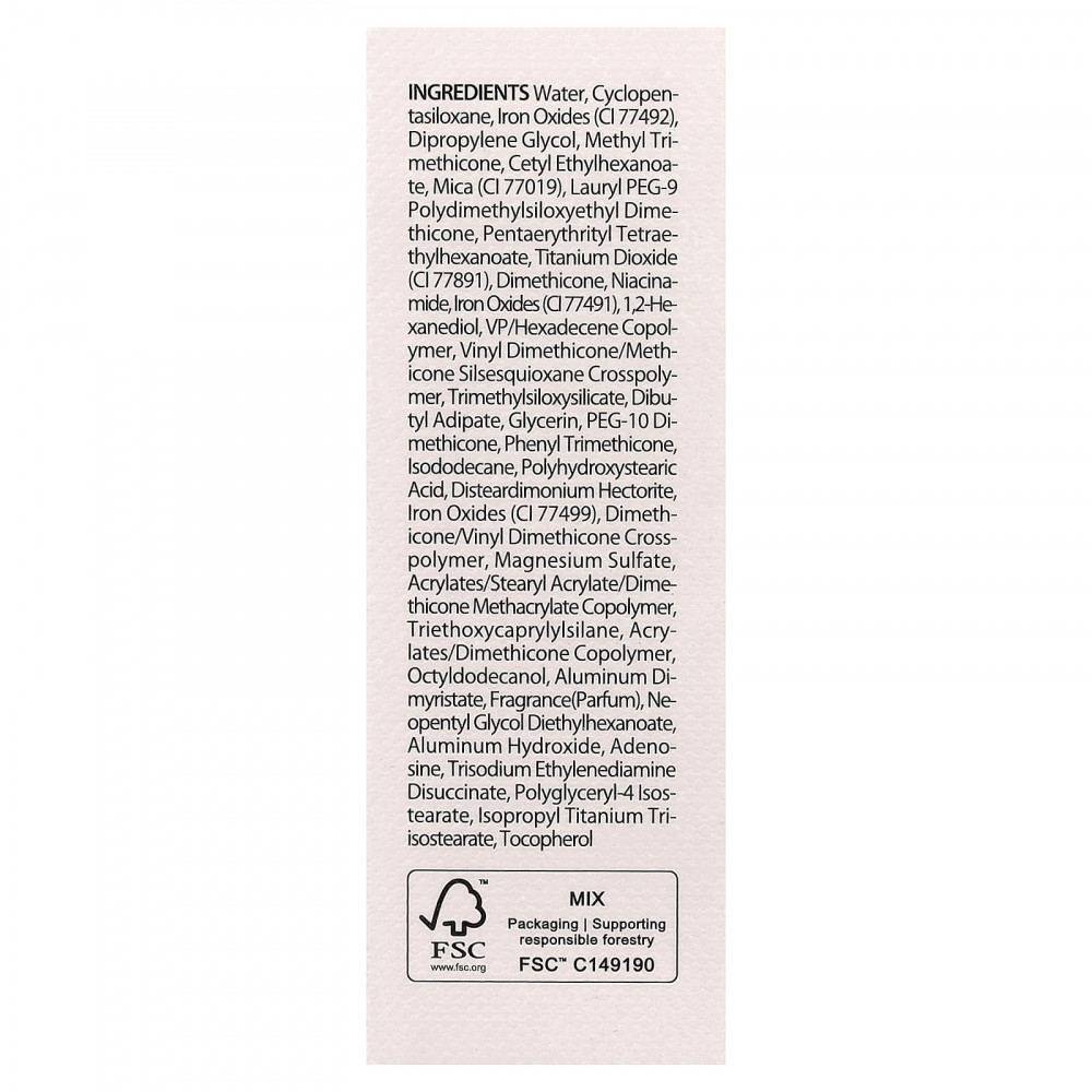 Вода, циклопентасилоксан, оксиды железа (CI 77492), дипропиленгликоль, метилтриметикон, цетилэтилгексаноат, слюда (CI 77019), лаурил ПЭГ-9 полидетилсилоксиэтил диметикон, пентаэритритил тетраэтилгексаноат, диоксид титана (CI 77891), диметикон, никотинамид, оксиды железа (CI 77491), 1,2-гександиол, ВП/гексадецен сополимер, винил диметикон/метикон силсесквиоксан кроссполимер, триметилсилоксисиликат, дибутиладипат, глицерин, ПЭГ-10 диметикон, фенилтриметикон, изододекан, полигидроксистеариновая кислота, дистеардимония гекторит, оксиды железа (CI 77499), диметикон/винил диметикон кроссполимер, сульфат магния, акрилаты/стеарил акрилат/диметикон метакрилат сополимер, триэтоксикаприлилсилан, сополимер акрилатов / диметикона, октилдодеканол, димиристат алюминия, отдушка (парфюмерная композиция), неопентилгликоль диэтилгексаноат, гидроксид алюминия, аденозин, тринатрия этилендиамин дисукцинат, полиглицерил-4 изостеарат, изопропиловый триизостеарат титана, токоферол.