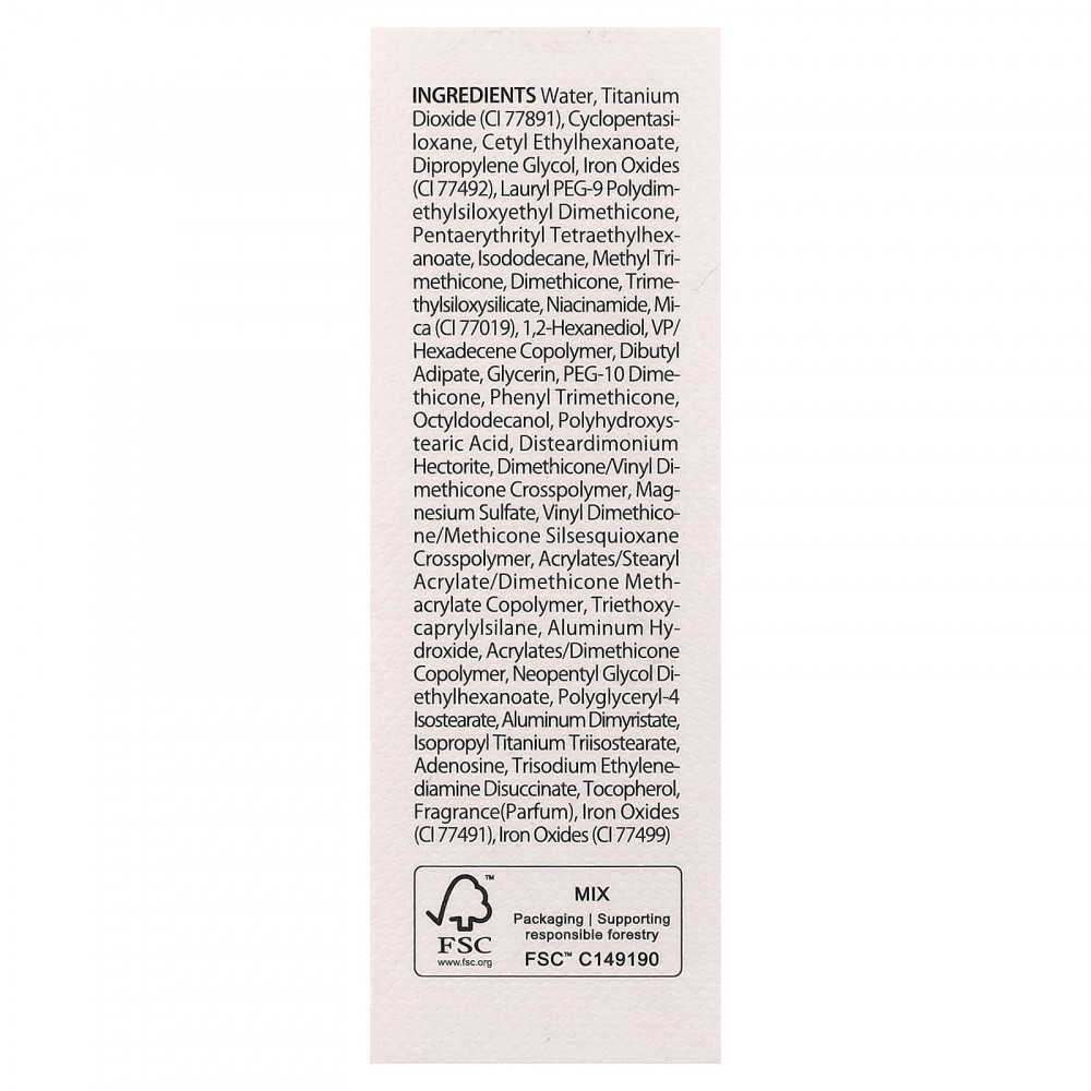 Вода, диоксид титана (CI 77891), циклопентасилоксан, цетилэтилгексаноат, дипропиленгликоль, оксиды железа (CI 77492), лаурил ПЭГ-9 полидетилсилоксиэтил диметикон, пентаэритритил тетраэтилгексаноат, изододекан, метилтриметикон, диметикон, триметилсилоксисиликат, никотинамид, слюда (CI 77019), 1,2-гександиол, ВП / гексадеценовый сополимер, дибутиладипат, глицерин, ПЭГ-10 диметикон, фенилтриметикон, октилдодеканол, полигидроксистеариновая кислота, дистеардимония гекторит, диметикон/винил диметикон кроссполимер, сульфат магния, винил диметикон/метикон силсесквиоксан кроссполимер, акрилаты/стеарил акрилат/диметикон метакрилат сополимер, триэтоксикаприлилсилан, гидроксид алюминия, сополимер акрилатов / диметикона, неопентилгликоль диэтилгексаноат, полиглицерил-4 изостеарат, димиристат алюминия, изопропиловый триизостеарат титана, аденозин, тринатрия этилендиамин дисукцинат, токоферол, отдушка (парфюмерная композиция), оксиды железа (CI 77491), оксиды железа (CI 77499).
