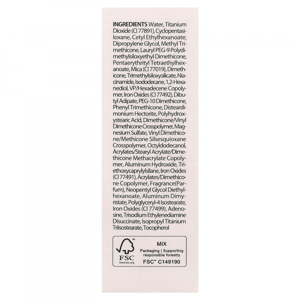 Вода, диоксид титана (CI 77891), циклопентасилоксан, цетилэтилгексаноат, дипропиленгликоль, метилтриметикон, лаурил ПЭГ-9 полидетилсилоксиэтил диметикон, пентаэритритил тетраэтилгексаноат, слюда (CI 77019), диметикон, триметилсилоксисиликат, никотинамид, изододекан, 1,2-гександиол, ВП/гексадецен сополимер, оксиды железа (CI 77492), дибутиладипат, ПЭГ-10 диметикон, фенилтриметикон, дистеардимония гекторит, полигидроксистеариновая кислота, диметикон/винил диметикон кроссполимер, сульфат магния, винил диметикон/метикон силсесквиоксан кроссполимер, октилдодеканол, акрилаты/стеарил акрилат/диметикон метакрилат сополимер, гидроксид алюминия, триэтоксикаприлилсилан, оксиды железа (CI 77491), сополимер акрилатов / диметикона, отдушка (парфюмерная композиция), неопентилгликоль диэтилгексаноат, димиристат алюминия, полиглицерил-4 изостеарат, оксиды железа (CI 77499), аденозин, тринатрия этилендиамин дисукцинат, изопропиловый триизостеарат титана, токоферол.
