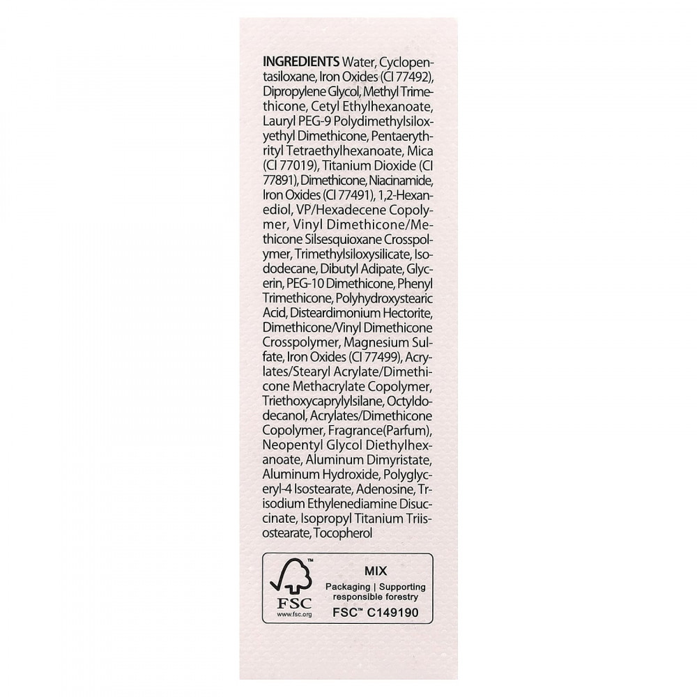 Вода, циклопентасилоксан, оксиды железа (CI 77492), дипропиленгликоль, метилтриметикон, цетилэтилгексаноат, лаурил ПЭГ-9 полидетилсилоксиэтил диметикон, пентаэритритил тетраэтилгексаноат, слюда (CI 77019), диоксид титана (CI 77891), диметикон, никотинамид, оксиды железа (CI 77491), 1,2-гександиол, ВП/гексадецен сополимер, винил диметикон/метикон силсесквиоксан кроссполимер, триметилсилоксисиликат, изододекан, дибутиладипат, глицерин, ПЭГ-10 диметикон, фенилтриметикон, полигидроксистеариновая кислота, дистеардимония гекторит, диметикон/винил диметикон кроссполимер, сульфат магния, оксиды железа (CI 77499), акрилаты/стеарил акрилат/диметикон метакрилат сополимер, триэтоксикаприлилсилан, октилдодеканол, сополимер акрилатов / диметикона, отдушка (парфюмерная композиция), неопентилгликоль диэтилгексаноат, димиристат алюминия, гидроксид алюминия, полиглицерил-4 изостеарат, аденозин, тринатрия этилендиамин дисукцинат, изопропиловый триизостеарат титана, токоферол.