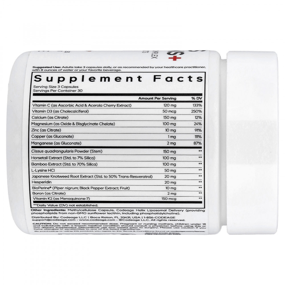 Codeage Bones Vitamins + содержит смесь витаминов D3, K2, кальция, магния, бора, цинка, марганца, гесперидина, спорыша японского, L-лизина, бамбука, экстрактов хвоща, BioPerine® и других уникальных ингредиентов. Эта добавка для здоровья костей поставляется с запатентованной липосомальной системой доставки Codeage Helix.