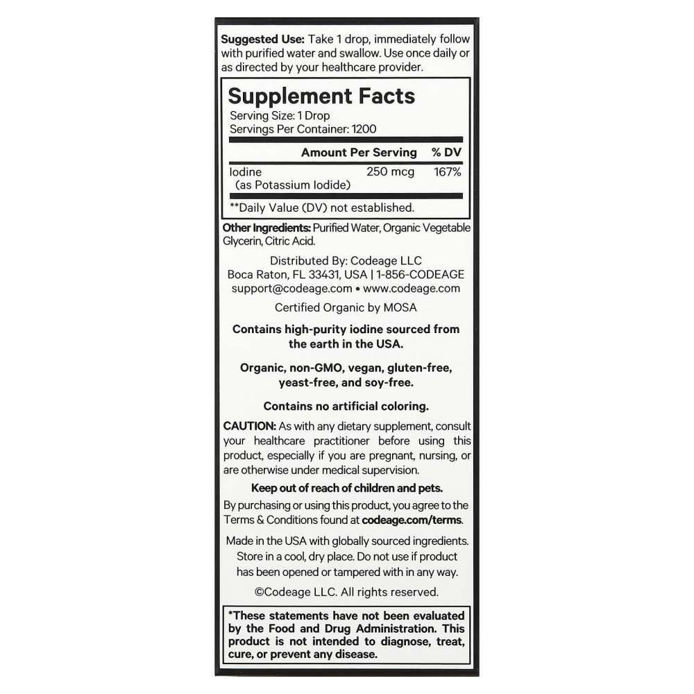 Йод+ от Codeage — это добавка с жидким йодом, в состав которой входят капли органического минерала йода для поддержки функции щитовидной железы, обмена веществ и уровня энергии. Эта веганская добавка с йодом с сертификатом USDA содержит 1200 порций в каждом флаконе, что позволяет обеспечить запас йода более чем на год.