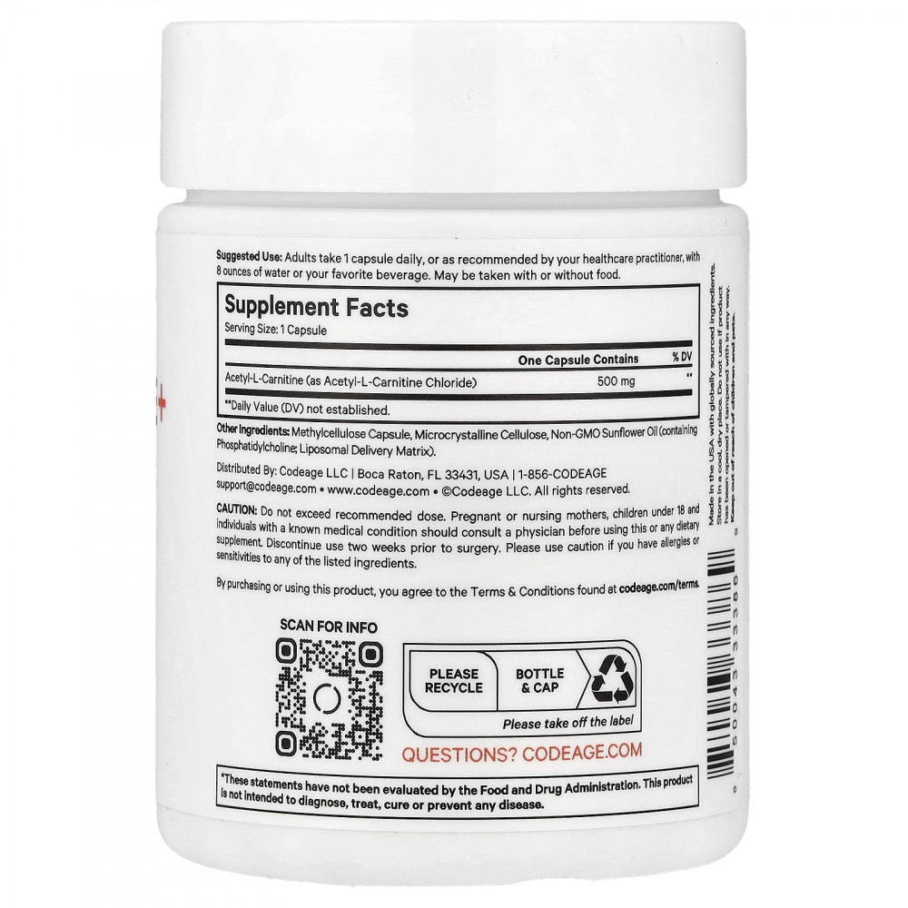 Липосомальный ацетил-L-карнитин+ от Codeage содержит 500 мг ацетил-L-карнитина в каждой порции. Это высококачественная добавка для ежедневного приёма. Нужно принимать всего одну капсулу в день.