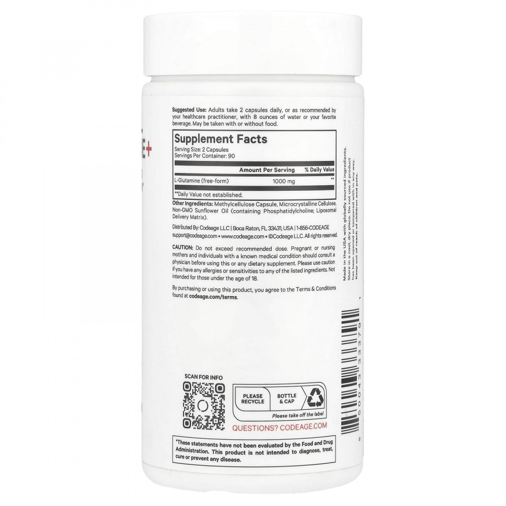 Добавка в капсулах с липосомальным L-глютамином от Codeage содержит 1000 мг L-глютамина в свободной форме на порцию. Эта добавка с глутамином также поставляется с липосомальной системой доставки, которая помогает улучшить всасывание и биодоступность*. Глутамин — это аминокислота, которая может помочь поддерживать здоровье иммунной системы, физическую форму, мышцы и кишечник.
