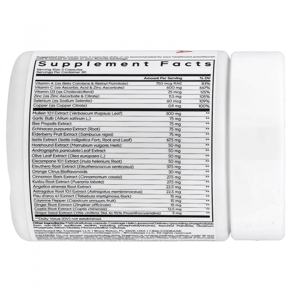 Липосомальный коровяк Ultra от Codeage содержит экстракт коровяка и смесь растительных компонентов, таких как бузина, эхинацея и чеснок, а также витамины A, C, D3 и минералы, такие как цинк и селен. В формуле используется липосомальная система доставки, которая часто используется для лучшего усвоения питательных веществ. Этот продукт не содержит ГМО, молочных продуктов, сои и глютена, а также содержит множество традиционных растительных экстрактов и мультивитаминов.