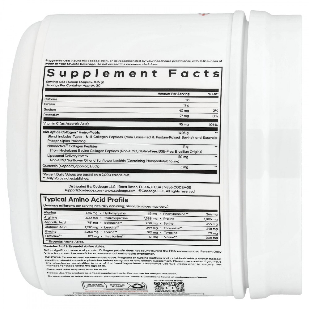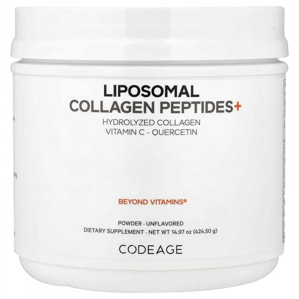 Липосомальные пептиды коллагена+ от Codeage — это комплексная добавка с коллагеном, содержащая смесь гидролизованного коллагена, витамина C, обогащённого кверцетином, и фосфолипидов. Этот продукт содержит 18 аминокислот в форме порошка без добавок.