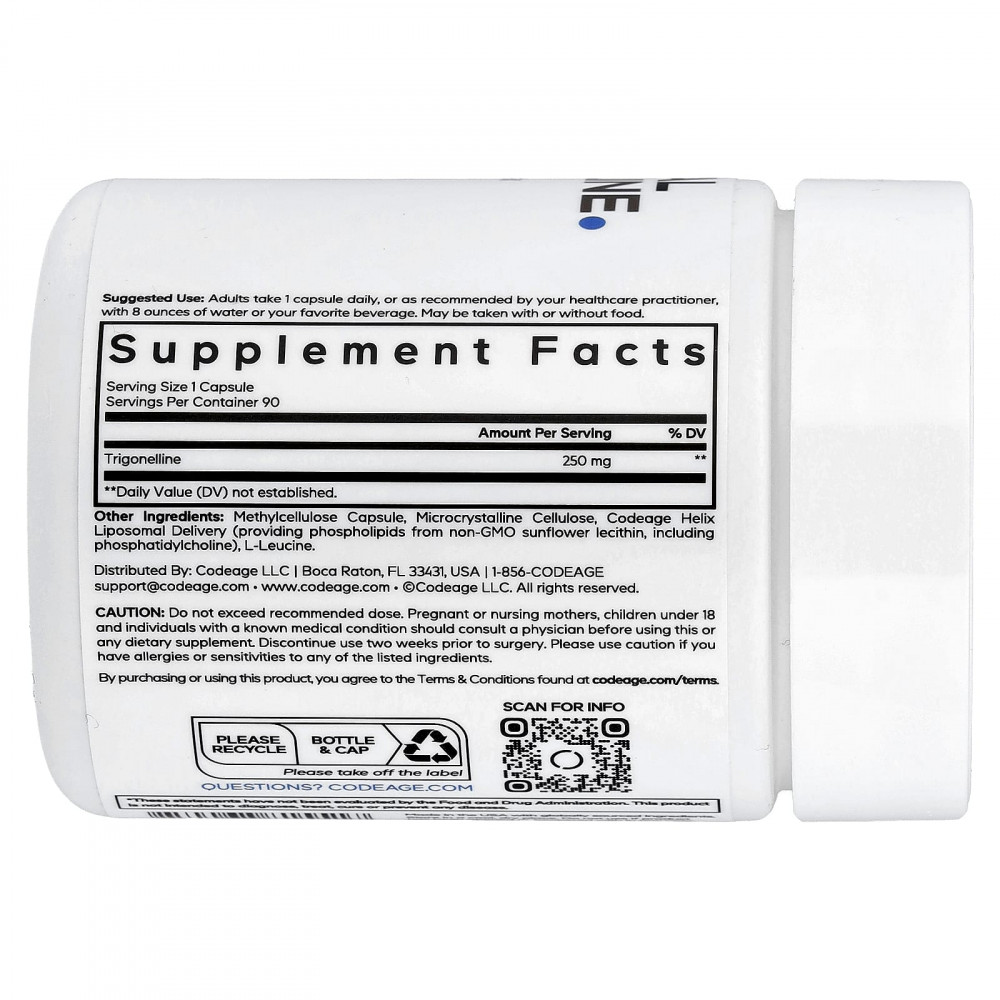 Codeage Liposomal Trigonelline - это усовершенствованная добавка с тригонеллином, включающая запатентованную липосомную доставку Codeage Helix с использованием подсолнечного лецитина без ГМО.