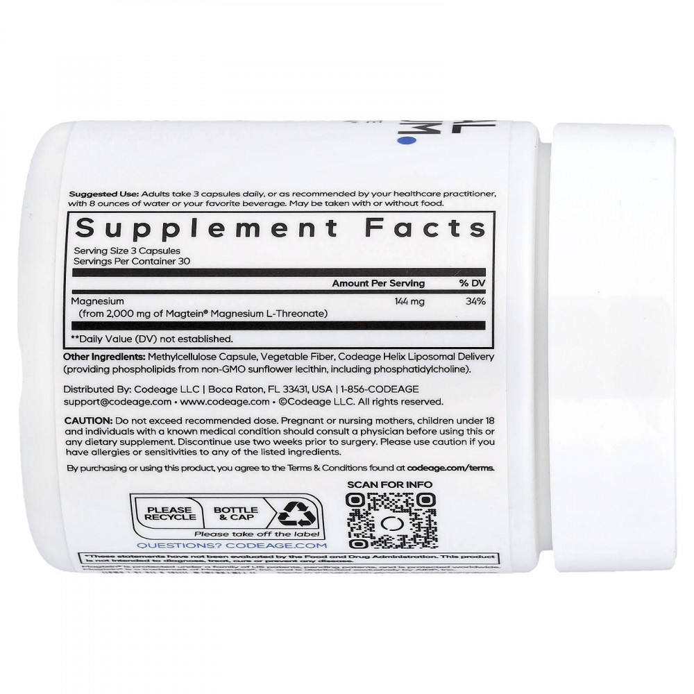 Липосомальный L-треонат магния от Codeage содержит усовершенствованный ингредиент магния из запатентованного L-треоната магния Magtein®, который способствует улучшению когнитивных функций и общему хорошему самочувствию.