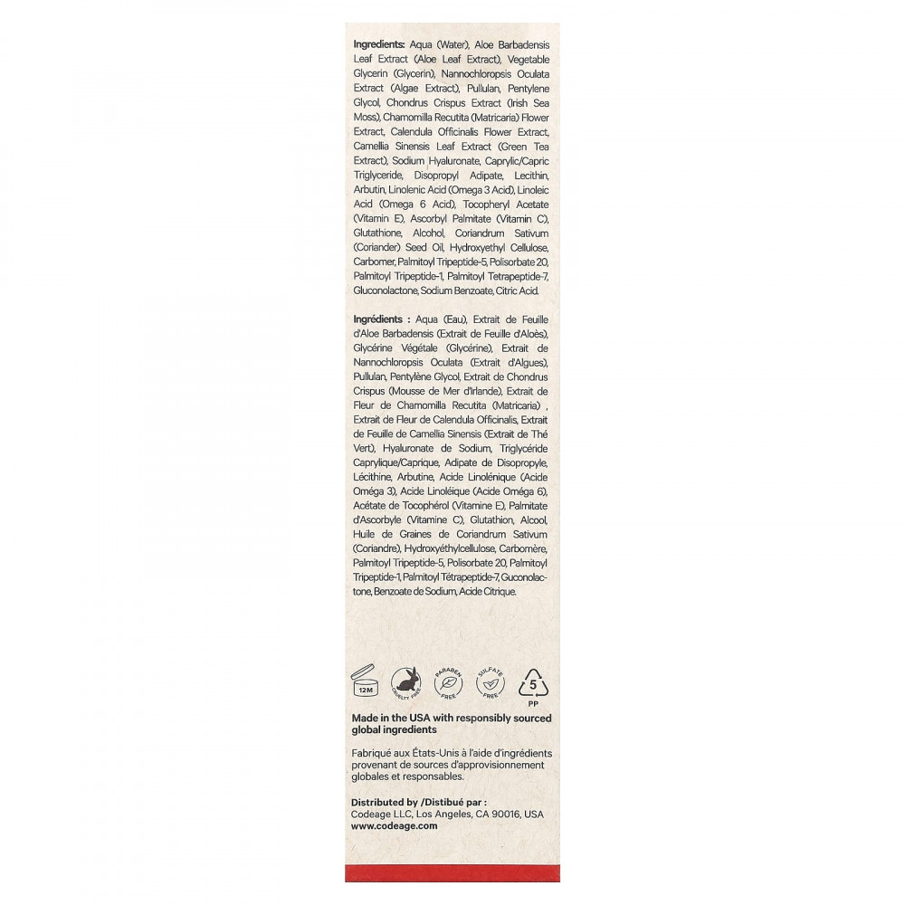 Вода (Aqua), экстракт листьев алоэ вера (Aloe barbadensis), растительный глицерин (глицерин), экстракт водоросли (Nannochloropsis oculata), пуллулан, пентилен гликоль, экстракт ирландского морского мха (Chondrus crispus), экстракт цветков ромашки лекарственной (Chamomilla recutita), экстракт цветков календулы (Calendula officinalis), экстракт листьев зеленого чая (Camellia sinensis), гиалуронат натрия, каприловый/каприновый триглицерид, диизопропил адипат, лецитин, арбутин, линоленовая кислота (кислота омега-3), линолевая кислота (кислота омега-6), токоферилацетат (витамин Е), аскорбил пальмитат (витамин C), глутатион, спирт, масло из семян кориандра (Coriandrum sativum), гидроксиэтилцеллюлоза, карбомер, пальмитоил трипептид-5, полисорбат 20, пальмитоил трипептид-1, пальмитоил тетрапептид-7, глюконолактон, бензоат натрия, лимонная кислота.