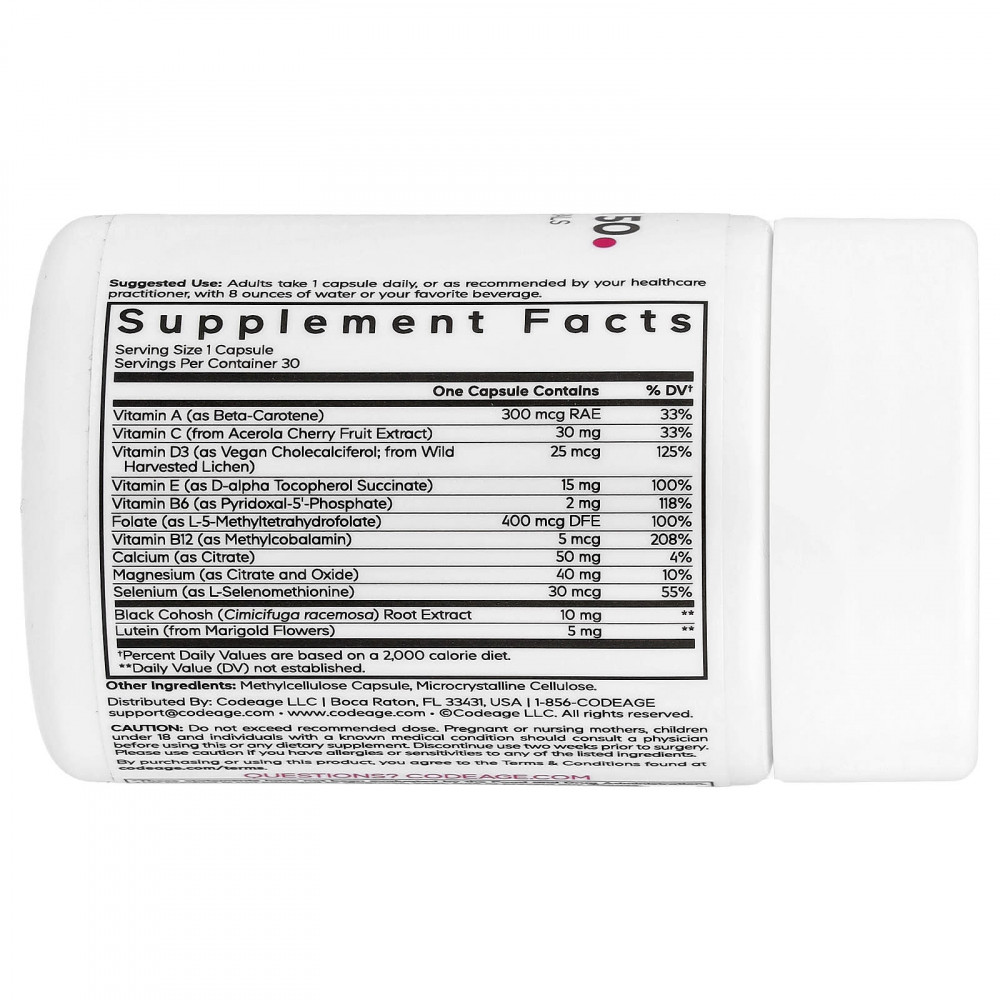 Мультивитаминный комплекс для женщин 50 Codeage — это усовершенствованная мультивитаминная добавка для ежедневного приема, разработанная специально для женщин старше 50 лет. содержит незаменимые витамины, такие как A, C, D3 и E, а также метилированные витамины группы B, такие как фолат и витамин B12. Он также содержит жизненно важные минералы, такие как кальций и магний, а также такие травы, как воронец кистевидный и экстракт бархатцев.