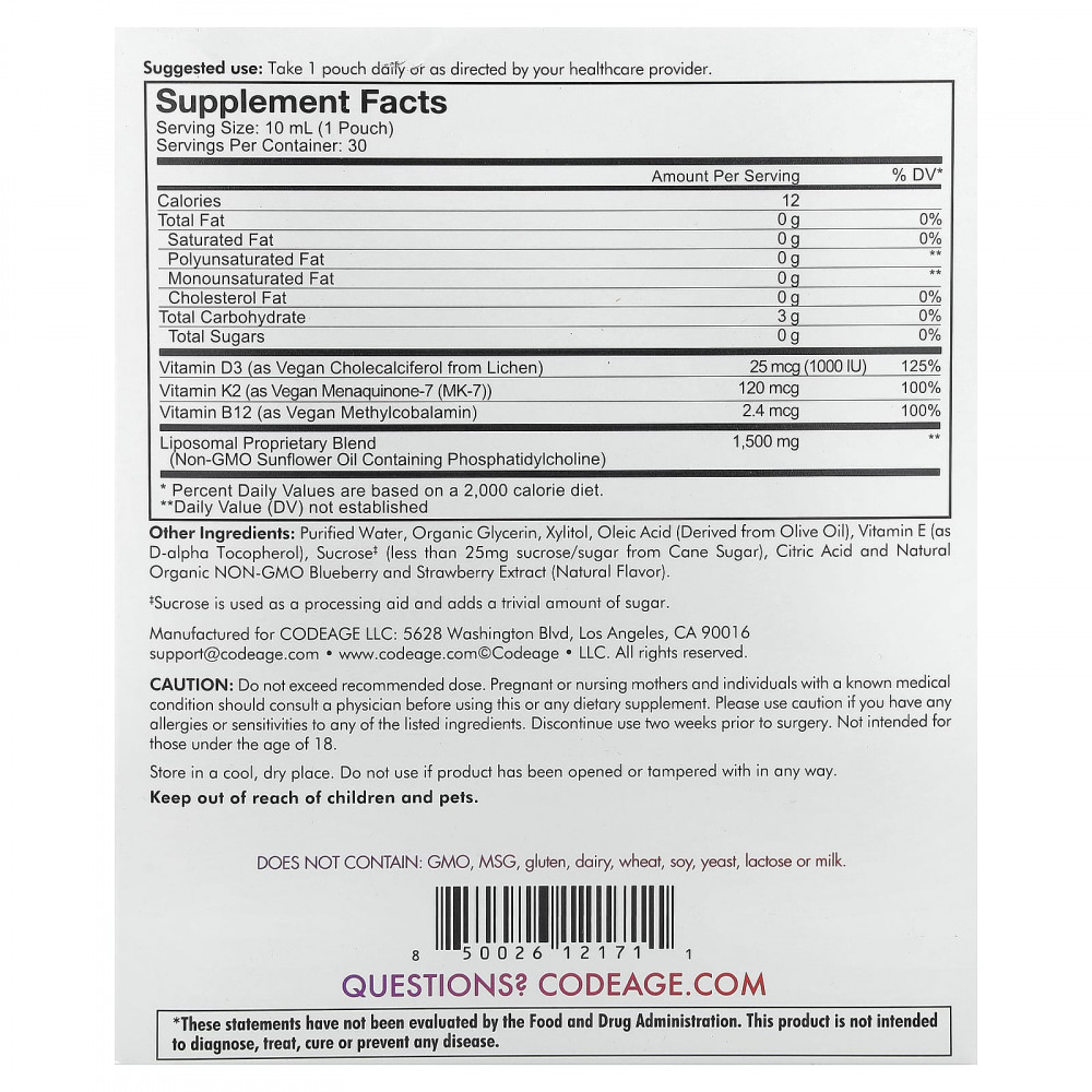 Липосомальные витамины D3, K2 и B12 в жидкой форме от Codeage Nanofood - это удобные растительные мультивитамины 3 в 1 в жидких пакетиках. Каждый саше содержит 1000 МЕ веганского витамина D3 из лишайника, витамина K2 (MK-7) и витамина B12 (метилкобаламина). В каждой упаковке содержится 30 порционных саше со вкусом ягод.