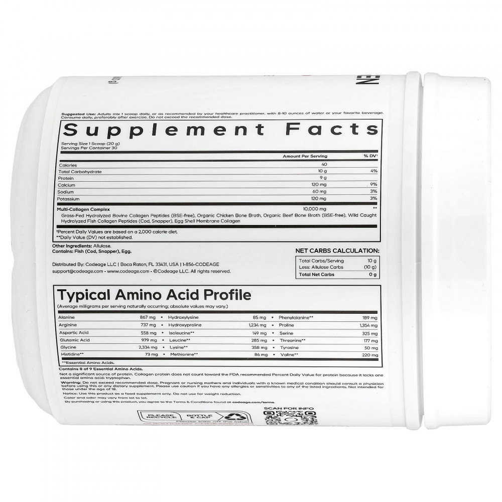 Мультипептидные пептиды коллагена Codeage с аллюлозой — это уникальная добавка, которая сочетает в себе 5 типов коллагена с 18 аминокислотами и аллюлозу, редкий сахар с чистым, слегка сладким вкусом. В ней не содержится 0 калорий, чистых углеводов и 0 гликемический индекс, что делает ее уникальной, удобной для смешивания добавкой в виде порошка с коллагеном и аллюлозой без вкусовых добавок.