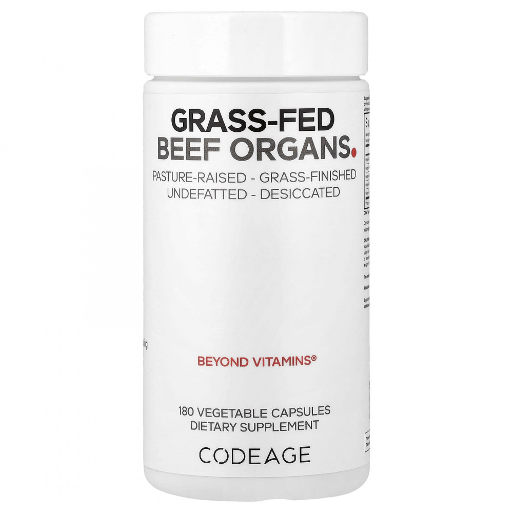 Добавка с говяжьими органами Codeage от животных травяного откорма, выращенных на пастбище, содержит говяжью печень, сердце, почки, поджелудочную железу и селезёнку — всё в одном удобном средстве. Эта смесь с сублимированными, необезжиренными и высушенными ингредиентами может обеспечить организм витаминами A, B2, B6, B12 и минералами, такими как железо, цинк и селен.