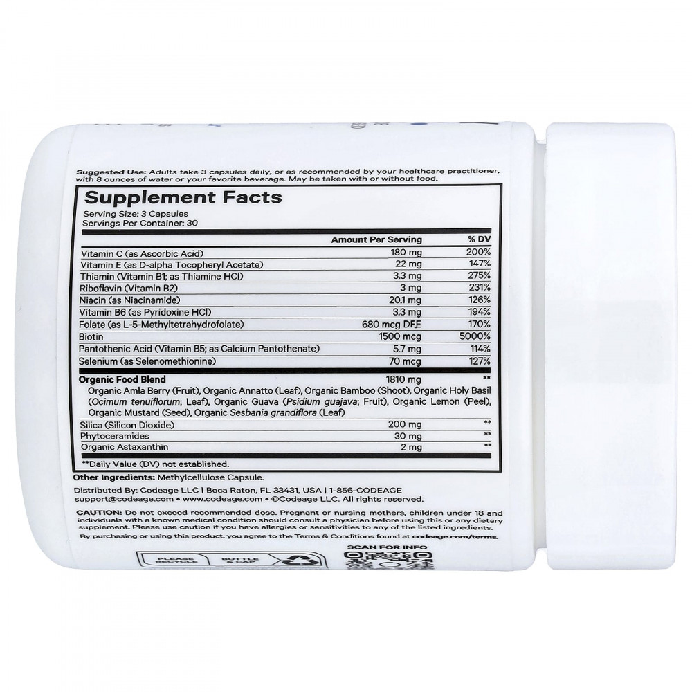 Помимо биотина, эта добавка содержит цельнопищевые витамины C и E, фитокерамиды и органический астаксантин, а также селен, тиамин, рибофлавин (витамины B1 и B2), пантотеновую кислоту (B5), витамин B6 (пиридоксин) и фолат.