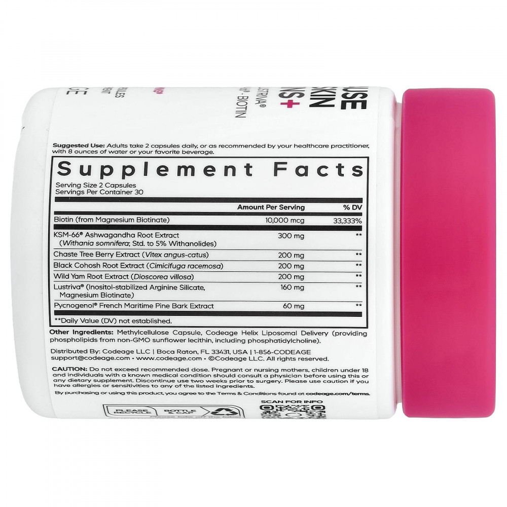 Витамины для волос и кожи при менопаузе CodeAge — это добавка премиального качества, содержащая Lustriva®, запатентованный комплекс из биотината магния и связанного силиката аргинина, которые содержат характерные формы биотина и силикона. Клинически изученный комплекс показал, что он способствует росту существующих волос, делая их более густыми и объемными, поддерживая здоровый внешний вид кожи. В период менопаузы у женщин могут иногда меняться волосы и кожа.