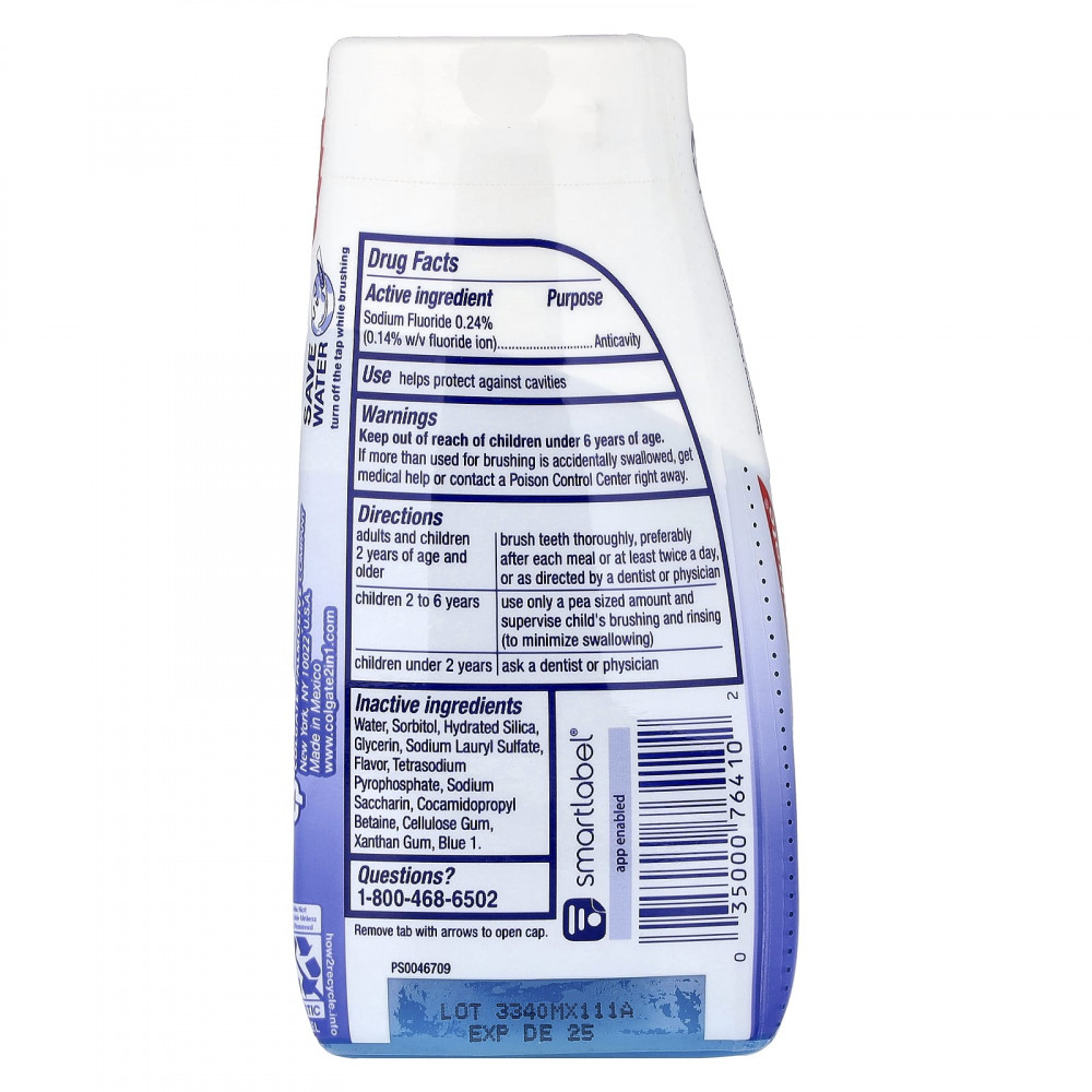 | Неактивные ингредиенты: Вода, сорбитол, гидратированный диоксид кремния, глицерин, лаурилсульфат натрия, ароматизатор, пирофосфат тетранатрия, сахарин натрия, кокамидопропилбетаин, целлюлозная камедь, ксантановая камедь, краситель синий 1. | |
