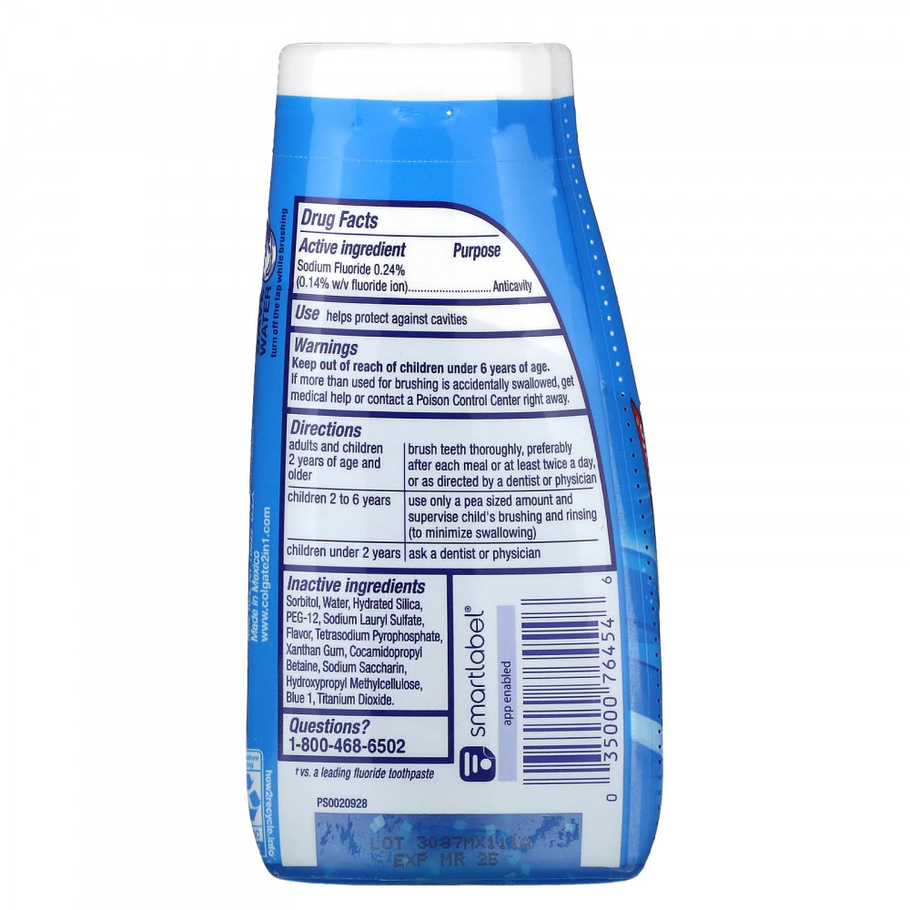 | Сорбитол, вода, гидратированный диоксид кремния, ПЭГ-12, лаурилсульфат натрия, ароматизатор, тетранатрий пирофосфат, ксантановая камедь, кокамидопропилбетаин, сахарин натрия, гидроксипропилметилцеллюлоза, синий 1, диоксид титана. | |