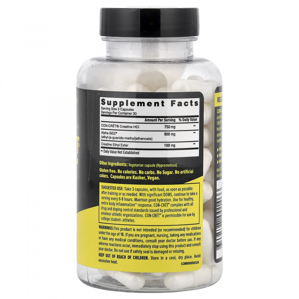 Принимать по 3 капсулы во время еды, как можно скорее после тренировки или по мере необходимости.При значительном коферменте продолжайте принимать по порции каждые 6-8 часов.Поддерживайте водный баланс.Использовать при здоровом воспалении всего тела + реакция.CON-CRET® соответствует всем стандартам контроля за препаратами и допингом, установленными профессиональными и любителей спортивными организациями.CON-CRET® разрешён для использования студентов, занимающихся физической активностью.