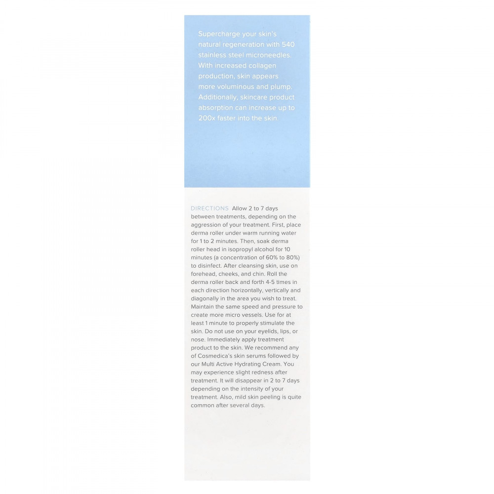 Делайте перерыв между обработками кожи от 2 до 7 дней, в зависимости от эффективности лечения. Сначала поместите дерматологический ролик под теплую проточную воду на 1–2 минуты. Затем замочите головку ролика для кожи в изопропиловом спирте (концентрация 60–80%) для стерилизации на 10 минут. После очищения кожи нанесите на лоб, щеки и подбородок. Прокрутите дерма-ролик вперед и назад 4–5 раз в каждом направлении по горизонтали, вертикали и диагонали в области, которую необходимо обработать. Поддерживайте ту же скорость и давление, чтобы создать больше микрососудов. Используйте в течение не менее 1 минуты, чтобы должным образом стимулировать кожу. Не наносить на веки, губы и нос. Немедленно нанесите лечебное средство на кожу. Мы рекомендуем любую сыворотку для кожи Cosmedica и наш мультиактивный увлажняющий крем. После процедуры вы можете почувствовать легкое покраснение. Она исчезнет через 2–7 дней в зависимости от интенсивности лечения. Кроме того, легкое шелушение кожи через несколько дней применения — обычное явление.