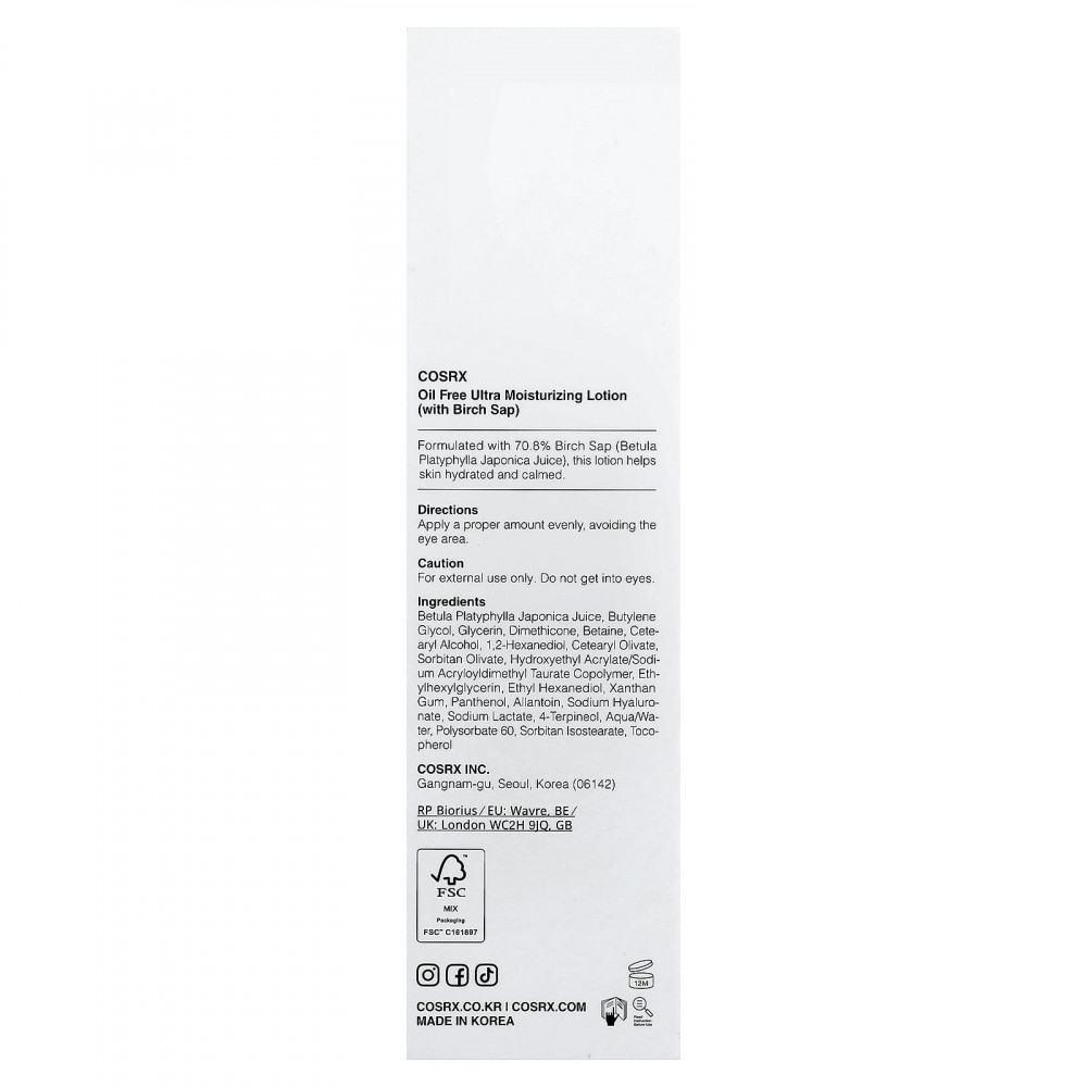 Сок берёзы плосколистой японской (Betula platyphylla japonica), бутиленгликоль, глицерин, диметикон, Бетаин, Цетеариловый спирт, 1,2-гександиол, цетеарилоливат, сорбитан оливат, гидроксиэтил акрилат/натрия акрилоилдиметилтаурата сополимер, этилгексилглицерин, этил гексанедиол, Ксантановая камедь, пантенол, Аллантоин, гиалуронат натрия, лактат натрия, 4-терпинеол, вода/вода, полисорбат 60, сорбитан изостеарат, токоферол.