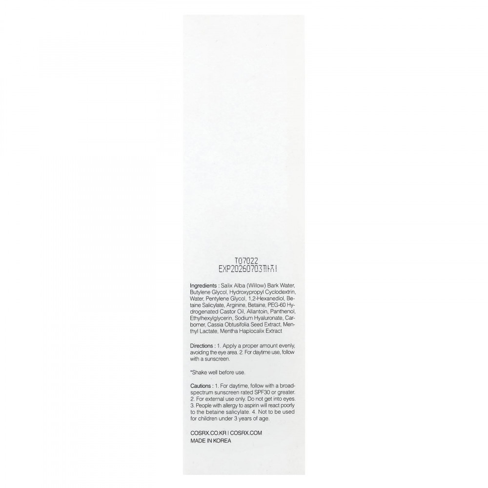 Вода из коры ивы (Salix alba), бутиленгликоль, гидроксипропил циклодекстрин, вода, пентилен гликоль, 1,2-гександиол, бетаин салицилат, аргинин, бетаин, ПЭГ-60 гидрогенизированное касторовое масло, аллантоин, пантенол, этилгексилглицерин, гиалуронат натрия, карбомер, экстракт семян кассии (Cassia obtusifolia), ментил лактат, экстракт мяты (Mentha haplocalix).