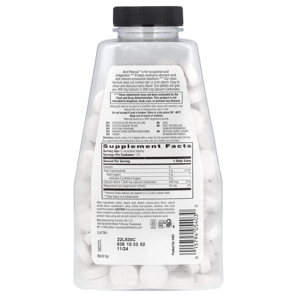 Acid Rescue ™ предназначена для лечения эпизодического кислотного несварения. Он помогает нейтрализовать кислоту в желудке и облегчает эпизодическую изжогу. Наша чистая формула не содержит талька и кукурузного крахмала. Легко жевать и обладает восхитительным ягодным вкусом. Две таблетки содержат 400 мг кальция (1000 мг карбоната кальция).