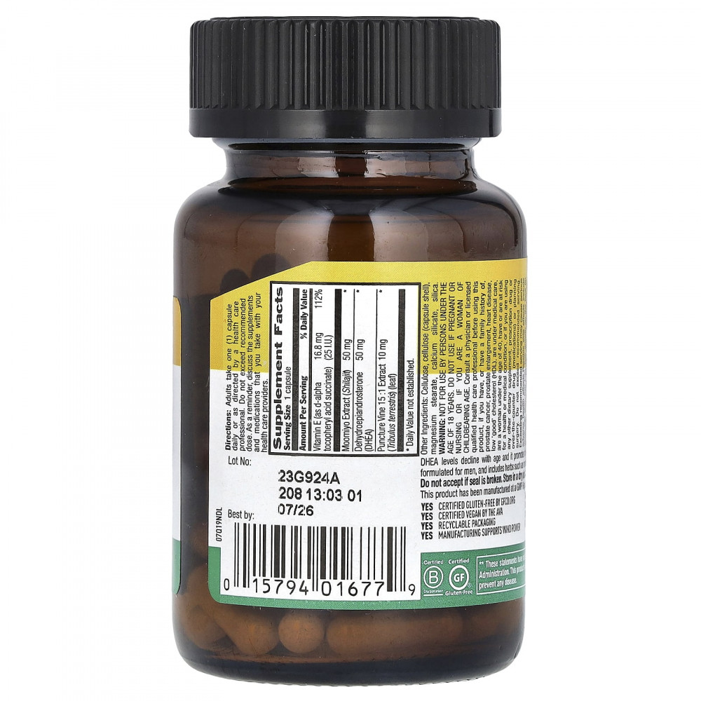 Уровень ДГЭА снижается с возрастом, что способствует выработке мужских гормонов. Этот продукт разработан для мужчин и содержит такие травы, как мумие и экстракт лозы.