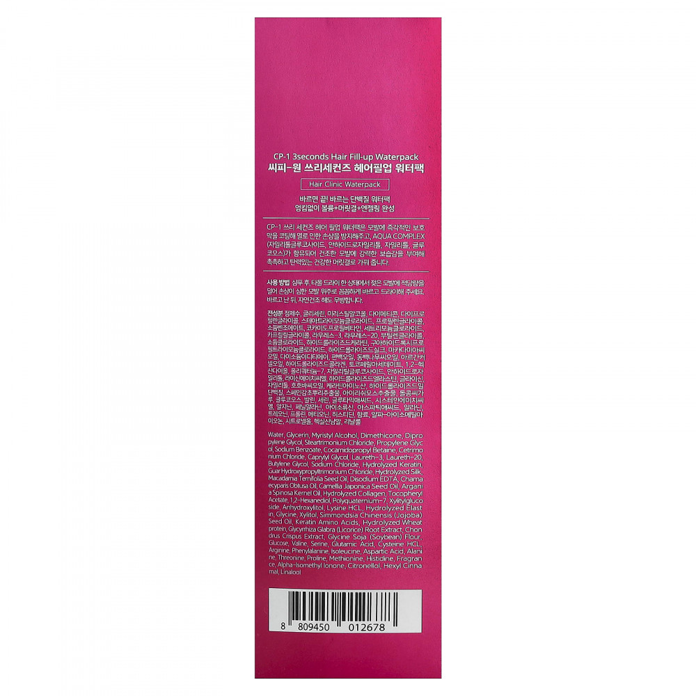 Вода, глицерин, миристиловый спирт, диметикон, дипропиленгликоль, стеартримония хлорид, пропиленгликоль, бензоат натрия, кокамидопропилбетаин, цетримония хлорид, каприлилгликоль, лаурет-3, лаурет-20, бутиленгликоль, хлорид натрия, гидролизованный кератин, гуар гидроксипропилтримония хлорид, гидролизованный шелк, масло макадамии (Macadamia ternifolia), двунатриевая ЭДТК, масло кипарисовика туполистного (Chamaecyparis obtusa), масло из семян камелии японской (Camellia japonica), аргановое масло (Argania spinosa), гидролизованный коллаген, токоферилацетат, 1,2-гександиол, поликватерниум-7, ксилитилглюкозид, ангидроксилитол, лизин гидрохлорид, гидролизованный эластин, глицин, ксилитол, масло из семян жожоба (Simmondsia chinensis), аминокислоты кератина, гидролизованный протеин из пшеницы, экстракт корня солодки (Glycyrrhiza glabra), экстракт ирландского мха (Chondrus crispus), соевая мука (Glycine soja), глюкоза, валин, серин, глутаминовая кислота, цистеин гидрохлорид, аргинин, фенилаланин, изолейцин, аспарагиновая кислота, аланин, треонин, пролин, метионин, гистидин, отдушка, альфа-изометилионон, цитронеллола, гексил циннамал, линалоол.