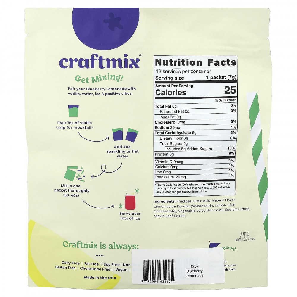 фруктоза, лимонная кислота, натуральный ароматизатор, порошок из сока лимона (мальтодекстрин, концентрат лимонного сока), овощного сока (краситель), цитрат натрия, экстракт листьев стевии.