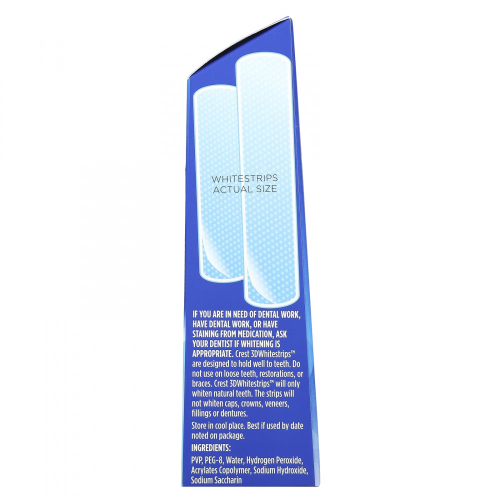 Если вы нуждаетесь в стоматологической помощи, проходите стоматологические процедуры или зубы окрасились от лекарств, уточните у вашего стоматолога, подходит ли вам отбеливание. Полоски Crest 3DWhitestrips™ разработаны таким образом, чтобы хорошо держаться на зубах. Не используйте на шатающихся зубах, восстановленных зубах или брекетах. Полоски Crest 3DWhitestrips™ отбеливают только натуральные зубы. Они не отбеливают коронки, виниры, пломбы и зубные протезы.