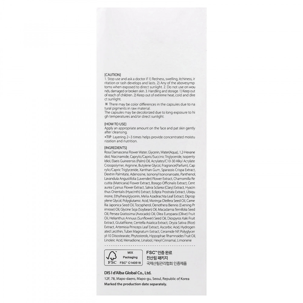 Вода из цветков розы дамасской (Rosa damascena), глицерин, вода (вода), 1,2-гександиол, никотинамид, каприловый / каприновый / янтарный триглицерид, изопентилдиол, пальмовое масло (Elaeis guineensis), акрилат/c10-30 алкил акрилат кроссполимер, аргинин, бутиленгликоль, отдушка (парфюмерная композиция), каприловый/каприновый триглицерид, ксантановая камедь, экстракт спарассиса курчавого (Sparassis crispa), декстрин пальмитат, аденозин, изононил изононаноат, пантенол, экстракт цветков лаванды (Lavandula angustifolia), экстракт цветков ромашки лекарственной (Chamomilla recutita), экстракт бурачника лекарственного, экстракт цветков Cent aurea cyanus, экстракт шалфея (Salvia sclarea), экстракт гиацинта (Hyacinthus orientalis), экстракт эклипты простроты, убихинон, этилгексилглицерин, экстракт листьев дерева ним (Melia azadirachta), дипропиленгликоль, полиглутаминовая кислота, масло из семян моринги масличной (Moringa oleifera), масло семян японской (Ilia japonica), токоферол, масло примулы вечерней (Oenothera biennis), соевое масло (Glycine soja), масло макадамии (Macadamia ternifolia), масло авокадо (Persea gratissima), оливковое масло (Olea europaea), подсолнечное масло (Helianthus annuus), экстракт плодов хурмы восточной (Diospyros kaki), глутатион, экстракт готу колы (Centella asiatica), экстракт риса (Oryza sativa), экстракт листьев полыни корейской (Artemisia princeps), аскорбиновая кислота, гидрогенизированный лецитин, экстракт белого трюфеля (Tuber magnatum), керамид NP, полиглицерил-10 диизостеарат, фитостеролы, масло из плодов облепихи крушиновидной (Hippophae rhamnoides), линолевая кислота, менадион, линалоол, гексил циннамал, лимонен.