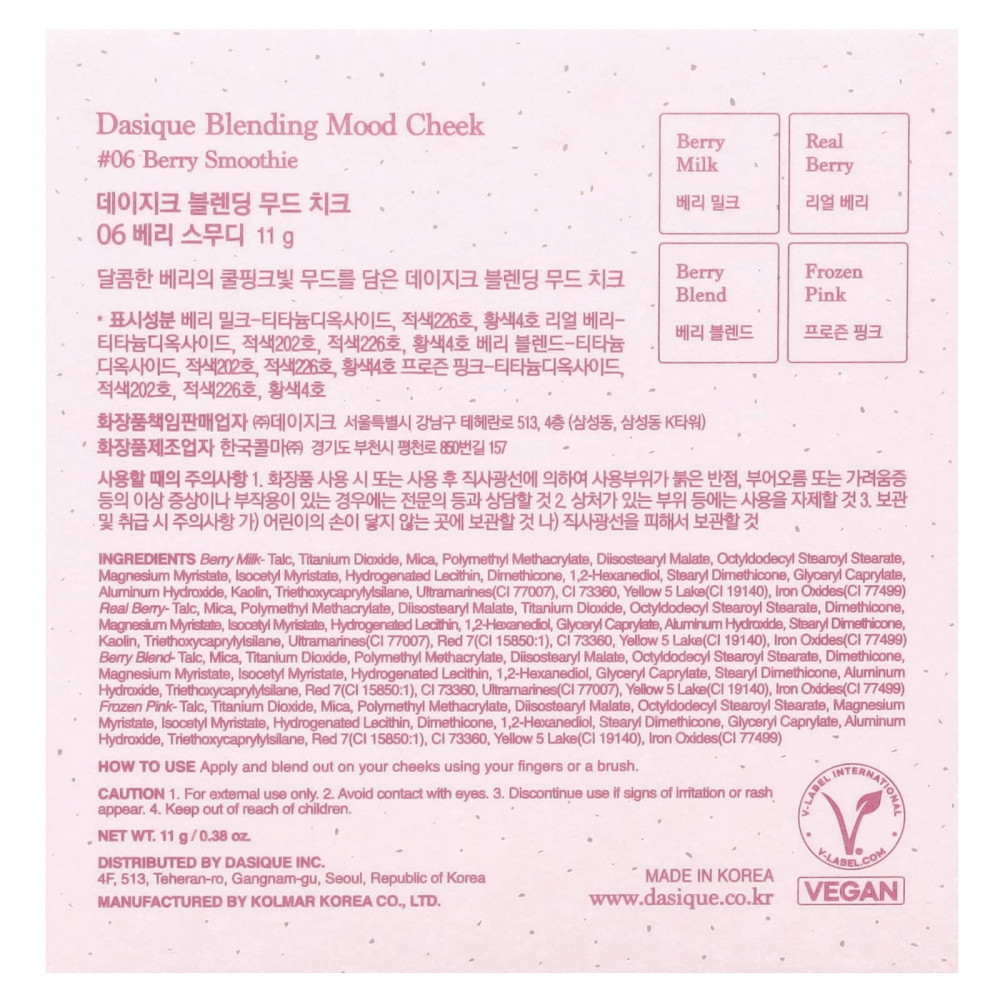 Ягодная смесь - тальк, слюда, диоксид титана, полиметилметакрилат, диизостеарил малат, октилдодецил стеароил стеарат, диметикон, миристат магния, изоцетил миристат, гидрогенизированный лецитин, 1,2-гександиол, глицерил каприлат, стеарил диметикон, гидроксид алюминия, триэтоксикаприлилсилан, красный 7 (CI 15850: 1), CI 73360, ультрамарины (CI 77007), желтое 5 озеро (CI 19140), оксиды железа (CI 77499).