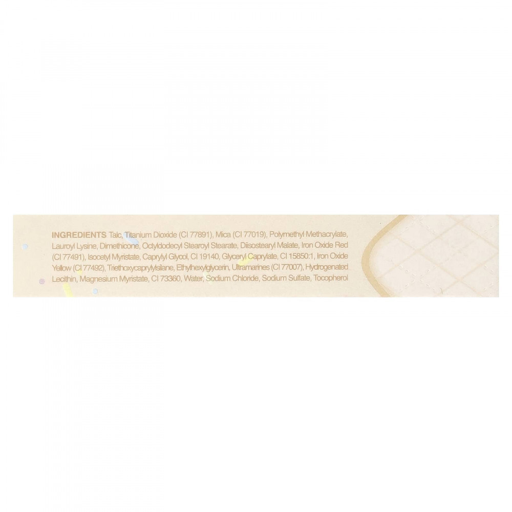 Тальк, диоксид титана (CI 77891), слюда (CI 77019), полиметилметакрилат, лаурил лизин, диметикон, октилдодецил стеароил стеарат, диизостеарил малат, оксид железа красный (CI 77491), изоцетил миристат, каприлилгликоль, CI 19140, глицерил каприлат, CI 15850:1, оксид железа жёлтый (CI 77492), триэтоксикаприлилсилан, этилгексилглицерин, ультрамарины (CI 77007), гидрогенизированный лецитин, миристат магния, CI 73360, вода, хлорид натрия, сульфат натрия, токоферол.