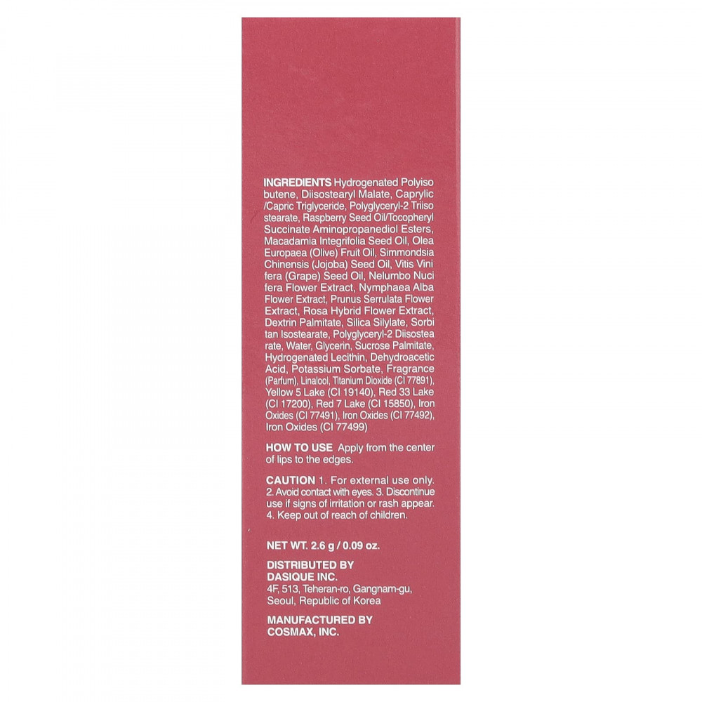 Гидрогенизированный полиизобутен, диизостеарил малат, каприловый/каприновый триглицерид, полиглицерил-2 триизостеарат, малиновое масло/токоферил сукцинат аминопропандиола, масло макадамии (Macadamia integrifolia), оливковое масло (Olea europaea), масло семян жожоба (Simmondsia chinensis), масло из виноградных косточек (Vitis vinifera), экстракт цветков лотоса орехоносного (Nelumbo nucifera), экстракт цветков кувшинки белой (Nymphaea alba), экстракт цветков вишни мелкопильчатой (Prunus serrulata), экстракт цветков розы (Rosa hybrida), декстрин пальмитат, силилат диоксида кремния, сорбитан изостеарат, полиглицерил-2 диизостеарат, вода, глицерин, пальмитат сахарозы, гидрогенизированный лецитин, дегидроуксусная кислота, сорбат калия, отдушка (парфюмерная композиция), линалоол, диоксид титана (CI 77891), краситель жёлтый 5 лак (CI 19140), краситель красный 33 лак (CI 17200), краситель красный 7 лак (CI 15850), оксиды железа (CI 77491), оксиды железа (CI 77492), оксиды железа (CI 77499).