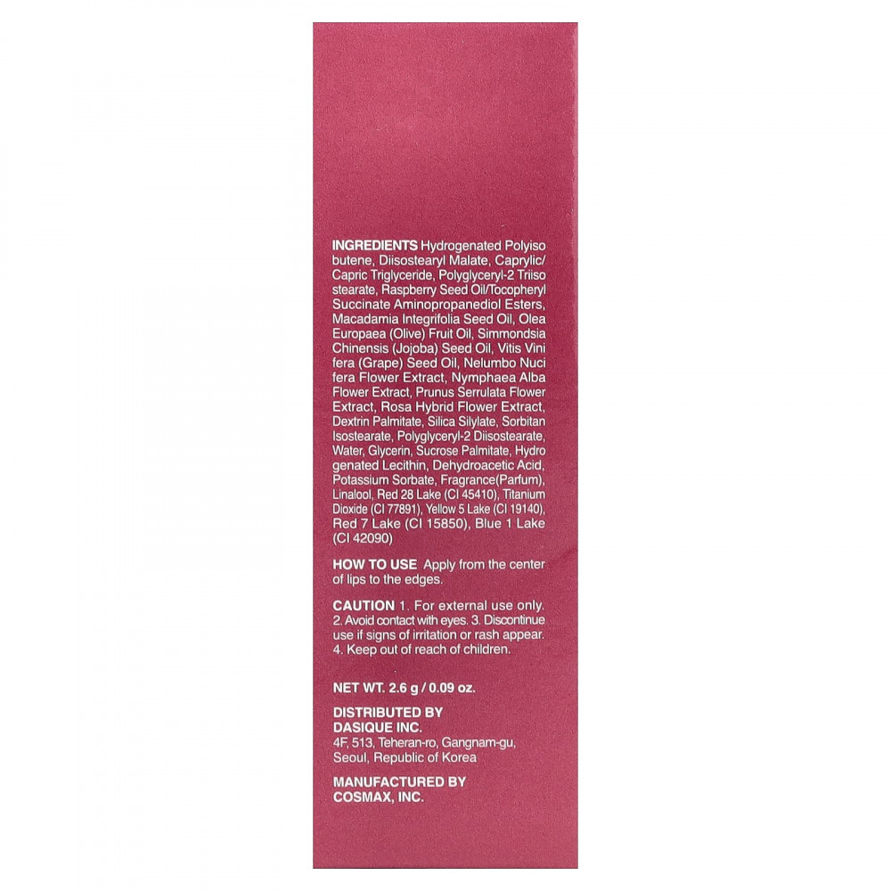 Гидрогенизированный полиизобутен, диизостеарил малат, каприловый/каприновый триглицерид, полиглицерил-2 триизостеарат, малиновое масло/токоферил сукцинат аминопропандиола, масло макадамии (Macadamia integrifolia), оливковое масло (Olea europaea), масло семян жожоба (Simmondsia chinensis), масло из виноградных косточек (Vitis vinifera), экстракт цветков лотоса орехоносного (Nelumbo nucifera), экстракт цветков кувшинки белой (Nymphaea alba), экстракт цветков вишни мелкопильчатой (Prunus serrulata), экстракт цветков розы (Rosa hybrida), декстрин пальмитат, силилат диоксида кремния, сорбитан изостеарат, полиглицерил-2 диизостеарат, вода, глицерин, пальмитат сахарозы, гидрогенизированный лецитин, дегидроуксусная кислота, сорбат калия, отдушка (парфюмерная композиция), линалоол, краситель красный 28 лак (CI 45410), диоксид титана (CI 77891), краситель жёлтый 5 лак (CI 19140), краситель красный 7 лак (CI 15850), краситель синий 1 лак (CI 42090).