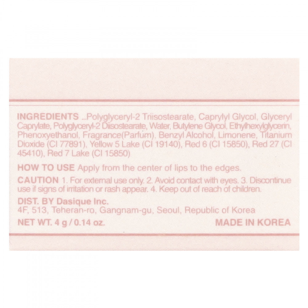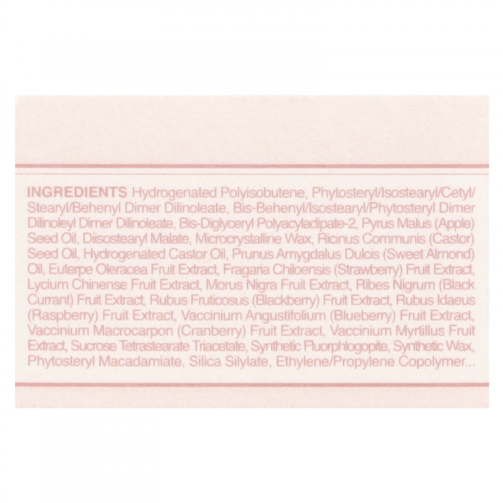 Гидрогенизированный полиизобутен, фитостерил / изостеарил / цетил / стеарил / бегенил димер дилинолеат, бис-бегенил / изостеарил / фитостерил димер дилинолеил димер дилинолеат, бис-диглицерил полиациладипат-2, Pyrus malus (яблочное масло, диизостеарил малат, микрокристаллический воск, касторовое масло (ricinus communis), гидрогенизированное касторовое масло, масло сладкого миндаля (Prunus amygdalus dulcis), экстракт плодов эвтерпы масличной (Euterpe oleracea), экстракт плодов клубники (Fragaria chiloensis), экстракт плодов лициума китайского (Lycium chinense), экстракт плодов черного дерева, экстракт плодов черной смородины (Ribes nigrum), экстракт плодов ежевики (Rubus fruticosus), экстракт плодов малины (Rubus idaeus), экстракт плодов черники (Vaccinium angustifolium), экстракт плодов клюквы (Vaccinium macrocarpon), экстракт плодов Vaccinium myrtillus, тетрастеарат триацетат сахарозы, синтетический фторфлогопит, синтетический воск, фитостерил макадамат, силилат диоксида кремния, сополимер этилена и пропилена, полиглицерил-2 триизостеарат, каприлил гликоль, глицерил каприлат, полиглицерил-2 диизостеарат, вода, бутиленгликоль, этилгексилглицерин, феноксиэтанол, отдушка (парфюмерная композиция), бензиловый спирт, лимонен, диоксид титана (CI 77891), желтое 5 озеро (CI 19140), красный 6 (CI 15850), красный 27 (CI 45410), красное озеро 7 (c) 15850.