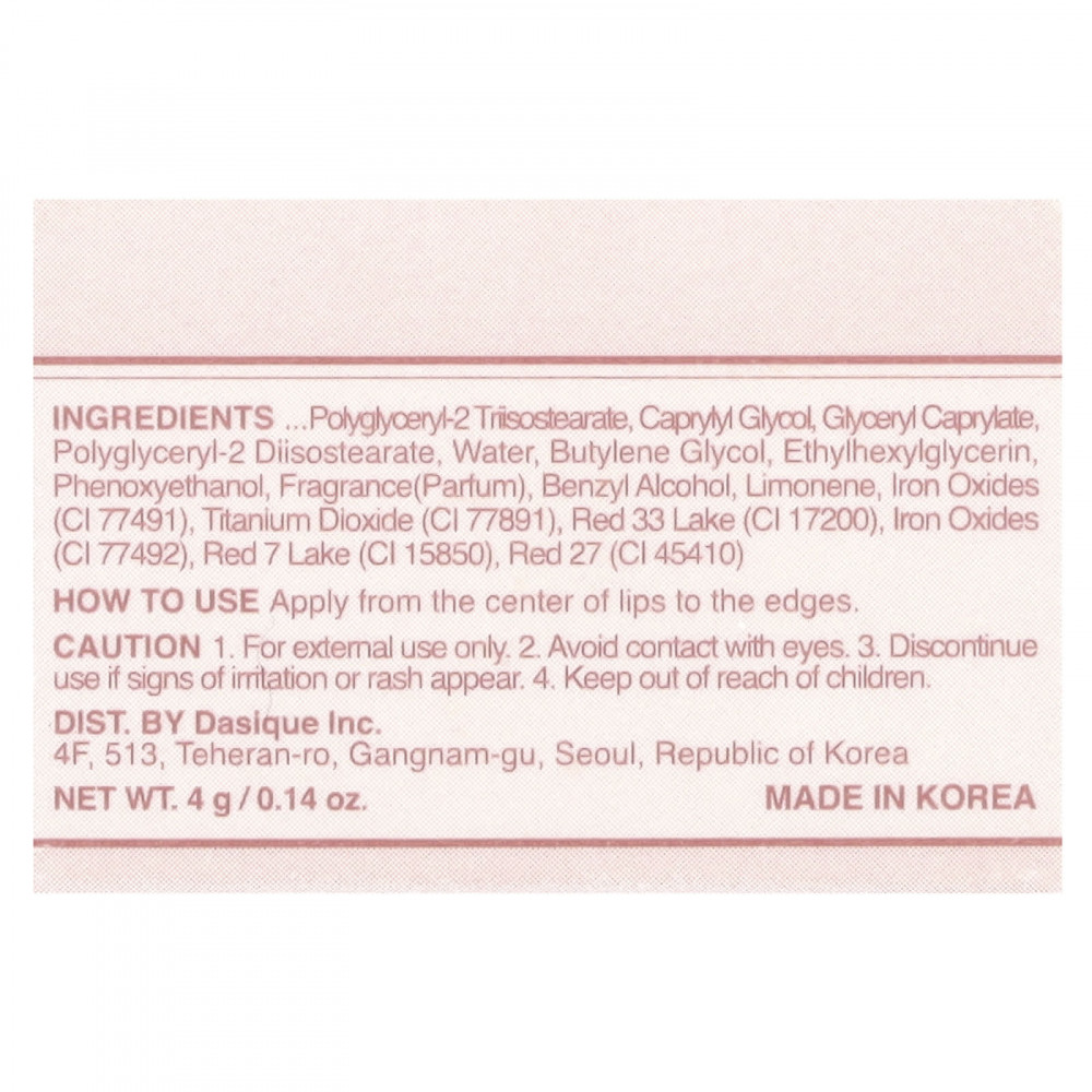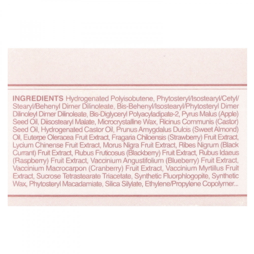 Гидрогенизированный полиизобутен, фитостерил / изостеарил / цетил / стеарил / бегенил димер дилинолеат, бис-бегенил / изостеарил / фитостерил димер дилинолеил димер дилинолеат, бис-диглицерил полиациладипат-2, масло из семян яблока (Pyrus malus), диизостеарил малат, микрокристаллический воск, касторовое масло (ricinus communis), гидрогенизированное касторовое масло, масло сладкого миндаля (Prunus amygdalus dulcis), экстракт плодов эвтерпы масличной (Euterpe oleracea), экстракт плодов клубники (Fragaria chiloensis), экстракт плодов лициума китайского (Lycium chinense), экстракт плодов черного дерева, экстракт плодов черной смородины (Ribes nigrum), экстракт плодов ежевики (Rubus fruticosus), экстракт плодов малины (Rubus idaeus), экстракт плодов черники (Vaccinium angustifolium), экстракт плодов клюквы (Vaccinium macrocarpon), экстракт плодов Vaccinium myrtillus, тетрастеарат триацетат сахарозы, синтетический фторфлогопит, синтетический воск, фитостерил макадамат, силилат диоксида кремния, сополимер этилена и пропилена, полиглицерил-2 триизостеарат, каприлил гликоль, глицерил каприлат, полиглицерил-2 диизостеарат, вода, бутиленгликоль, этилгексилглицерин, феноксиэтанол, отдушка (парфюмерная композиция), бензиловый спирт, лимонен, оксиды железа (CI 77491), диоксид титана (CI 77891), красное озеро 33 (CI 17200), оксиды железа (CI 77492), красное озеро 7 (CI 15850), красный 27 (CI 45410).