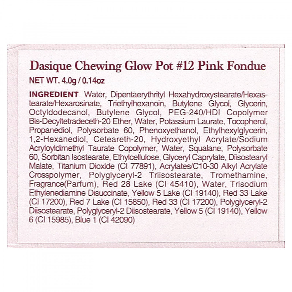 Вода, дипентаэритритил гексагидроксистеорат/гексастерат/гексаросинат, триэтилгексаноин, бутиленгликоль, глицерин, октилдодеканол, бутиленгликоль, ПЭГ-240/ГДИ сополимер бис-децифтетрадецет-20 эфир, вода, лаурат калия, токоферол, пропандиол, полисорбат 60, феноксиэтанол, этилгексилглицерин, 1,2-гександиол, цетеарет-20, гидроксиэтил акрилат/натрия акрилоилдиметилтаурата сополимер, вода, сквалан, полисорбат 60, сорбитан изостеарат, этилцеллюлоза, глицерил каприлат, диизостеарил малат, диоксид титана (CI 77891), акрилат/c10-30 алкил акрилат кроссполимер, полиглицерил-2 триизостеарат, трометамин, отдушка (парфюмерная композиция), краситель красный 28 лак (CI 45410), вода, тринатрия этилендиамин дисукцинат, краситель жёлтый 5 лак (CI 19140), краситель красный 33 лак (CI 17200), краситель красный 7 лак (CI 15850), краситель красный 33 (CI 17200), полиглицерил-2 диизостеарат, полиглицерил-2 диизостеарат, краситель жёлтый 5 (CI 19140), краситель желтый 6 (CI 15985), краситель синий 1 (CI 42090).
