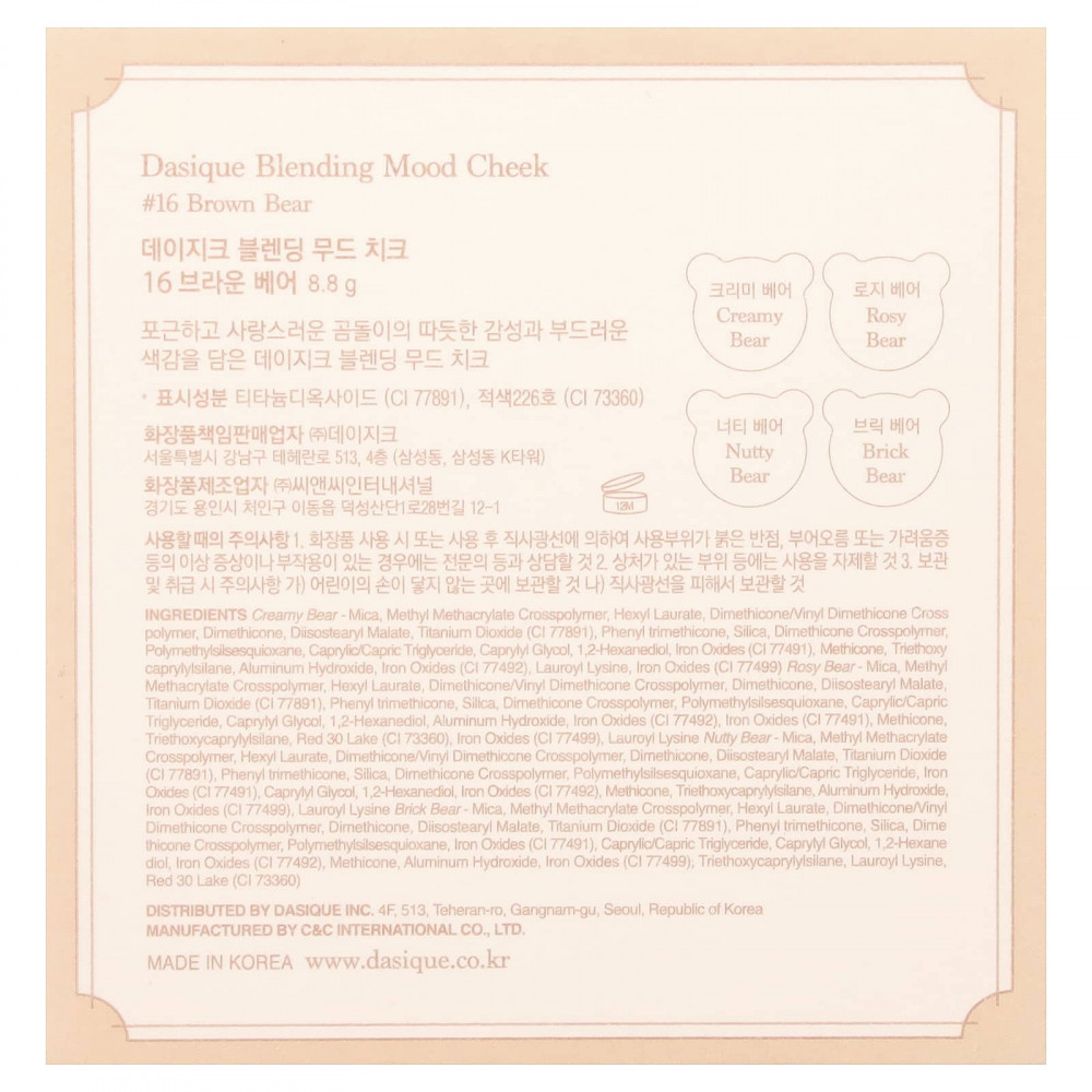 Кирпичный мишка: слюда, метил метакрилат кроссполимер, гексил лаурат, диметикон/винил диметикон кроссполимер, диметикон, диизостеарил малат, диоксид титана (CI 77891), фенилтриметикон, диоксид кремния, диметикон кроссполимер, полиметилсилсесквиоксан, оксиды железа (CI 77491), каприловый/каприновый триглицерид, каприлилгликоль, 1,2-гександиол, оксиды железа (CI 77492), метикон, гидроксид алюминия, оксиды железа (CI 77499); триэтоксикаприлилсилан, лаурил лизин, краситель красный 30 лак (CI 73360).