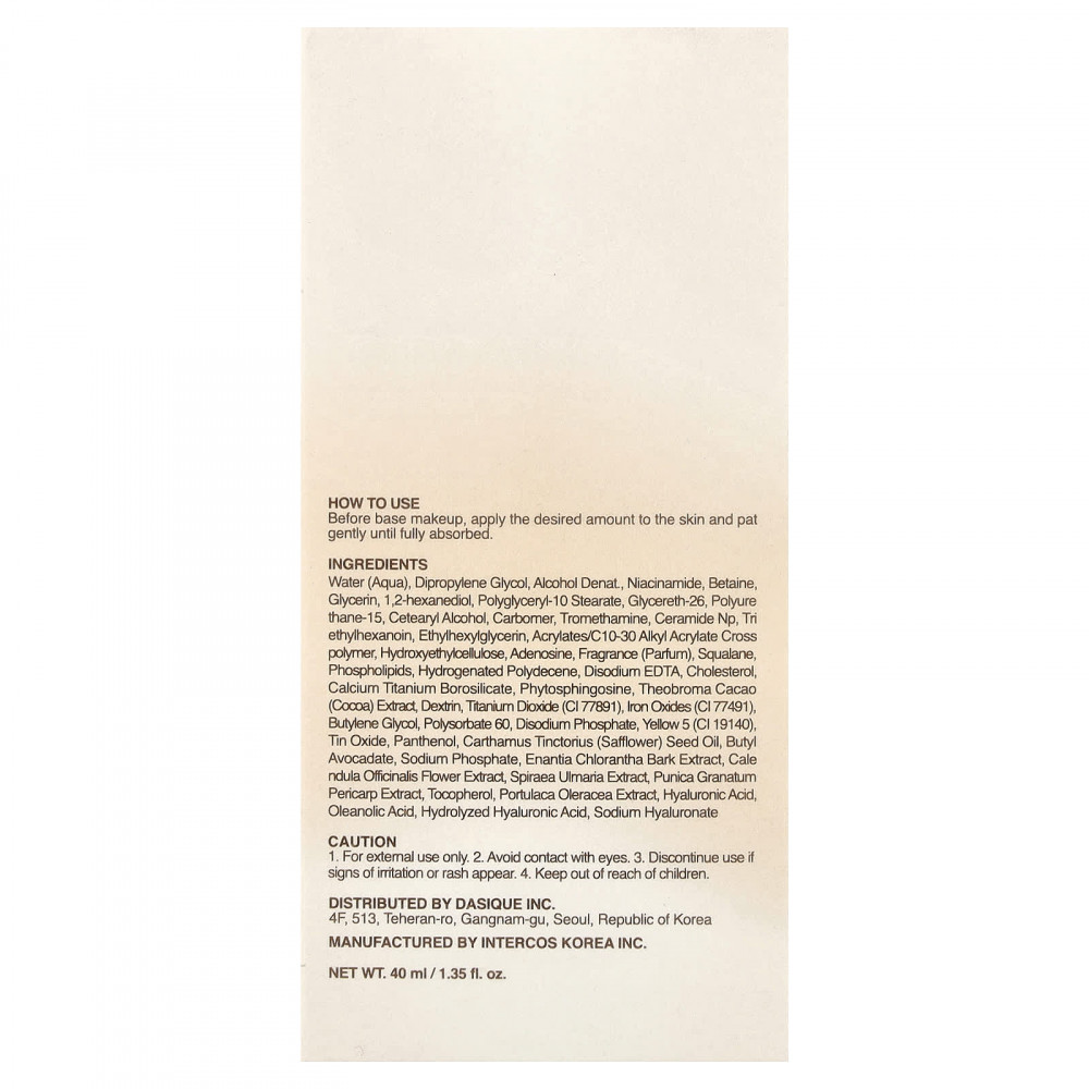 Вода, дипропиленгликоль, денатурированный спирт, никотинамид, бетаин, глицерин, 1,2-гександиол, полиглицерил-10 стеарат, глицерет-26, полиуретан-15, цетеариловый спирт, карбомер, трометамин, керамид NP, триэтилгексаноин, этилгексилглицерин, акрилат/c10-30 алкил акрилат кроссполимер, гидроксиэтилцеллюлоза, аденозин, отдушка (парфюмерная композиция), сквалан, фосфолипидов, гидрогенизированный полидецен, двунатриевая ЭДТК, холестерина, боросиликат кальция и титана, фитосфингозин, экстракт какао (Theobroma cacao), декстрин, диоксид титана (CI 77891), оксиды железа (CI 77491), бутиленгликоль, полисорбат 60, динатрия фосфат, краситель жёлтый 5 (CI 19140), оксид олова, пантенол, масло семян сафлора (Carthamus tinctorius), бутил авокадат, фосфат натрия, экстракт коры африканского дерева Энантия (Enantia chlorantha), экстракт цветков календулы (Calendula officinalis), экстракт таволги (Spiraea ulmaria), экстракт околоплодника (Punica granatum), токоферол, экстракт портулака огородного (Portulaca oleracea), гиалуроновая кислота, олеаноловая кислота, гидролизованная гиалуроновая кислота, гиалуронат натрия.