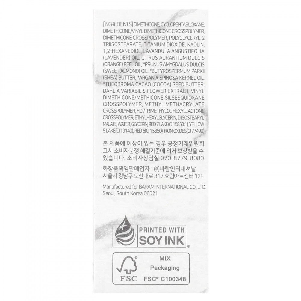 диметикон, циклопентасилоксан, диметикон/винил диметикон кроссполимер, диметикон кроссполимер, полиглицерил-2 триизостеарат, диоксид титана, каолин, 1,2-гександиол, лавандовое масло (Lavandula angustifolia), масло из цедры апельсина (Citrus aurantium dulcis), масло сладкого миндаля (Prunus amygdalus dulcis), масло ши (Butyrospermum parkii), масло из косточек аргании (Argania spinosa), масло из семян какао (Theobroma), экстракт цветков георгина (Dahlia variabilis), винил диметикон/метикон силсесквиоксан кроссполимер, метил метакрилат кроссполимер, гександиизоцианат/триметилол хексиллактона кроссполимер, этилгексилглицерин, диизостеарил малатная вода, глицерин, красное озеро 7 (CI 15850: 1), желтое 5 озеро (CI 19140), красный 6 (CI 15850), оксиды железа (CI 77499).