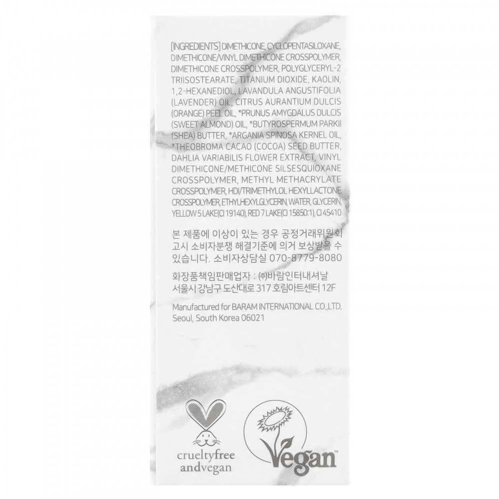 диметикон, циклопентасилоксан, диметикон/винил диметикон кроссполимер, диметикон кроссполимер, полиглицерил-2 триизостеарат, диоксид титана, каолин, 1,2-гександиол, лавандовое масло (Lavandula angustifolia), масло из цедры апельсина (Citrus aurantium dulcis), масло сладкого миндаля (Prunus amygdalus dulcis), * Butyrospermum parkii s iea) масло, масло из косточек аргании (Argania spinosa), масло из семян какао (Theobroma), экстракт цветков георгина (Dahlia variabilis), винил диметикон/метикон силсесквиоксан кроссполимер, метил метакрилат кроссполимер, гександиизоцианат/триметилол хексиллактона кроссполимер, этилгексилглицерин, вода, глицерин, желтое 5 озеро (CI 19140), красное озеро 7 (CI 15850: 1), CI 45410