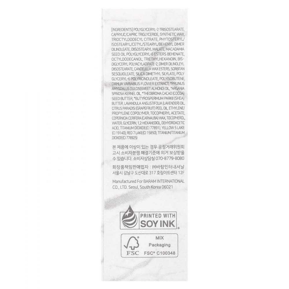 Полиглицерил-2 триизостеарат, каприловый/каприновый триглицерид, синтетический воск, триоктилдодецилцитрат, фитостерил / изостеарил / цетил / стеарил / бегенил димер дилинолеат, диизостеарил малат, масло семян макадамии, полиглицерил-6 эфиры бегенат, октилдодеканол, триэтилгексаноин, бис-диглицерил полиациладипат-2, димер дилинолеил диизостеарат, эфиры канделильского воска, сорбитана сесквиолеат, диметил силилат диоксида кремния, поли глицерил-6 полирицинолеат, полиизобутен, экстракт цветков георгина (Dahlia variabilis), масло сладкого миндаля (Prunus amygdalus dulcis), масло из косточек аргании (Argania spinosa), масло из семян какао (Theobroma), масло ши (Butyrospermum parkii), лавандовое масло (Lavandula angustifolia), масло из цедры грейпфрута (Citrus paradisi), сополимер этилена и пропилена, токоферилацетат, карнаубский воск (Copernicia cerifera), токоферол, вода, глицерин, 1,2-гександиол, дегидроуксусная кислота, диоксид титана (CI 77891), краситель желтый 5 лак (CI 19140), красное озеро 7 (CI 15850), титан / диоксид титана (CI 778925).