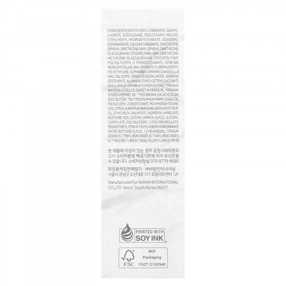 Диэтилгексилкарбонат, изоамил лаурат, изоэйкозан, диизостеарил малат, этилгексил гидроксистеарат, изононил изононаноат, карбонат кальция, диметикон, кроссполимер дифенилдиметикона / винилдифенилдиметикона / силсесквиоксана, винил диметикон/метикон силсесквиоксан кроссполимер, полиглицерил-2 триизостеарат, церезин, микрокристаллический воск, синтетический фторфлогопит, полиэтилен, канделильский воск (Euphorbia cerifera), диглицерил себацинат / изопальмитат, сорбитан изостеарат, алюминия крахмал октенилсукцинат, диоксид кремния, экстракт цветков георгина (Dahlia variabilis), масло сладкого миндаля (Prunus amygdalus dulcis) * масло из косточек арганы (Argania spinosa), масло из семян какао (Theobroma), масло ши (Butyrospermum parkii), полиглицерил-2 диизостеарат, полигидроксистеариновая кислота, масло бергамота (Citrus aurantium bergamia), этилгексил пальмитат, изопропил миристат, изостеариновая кислота, лецитин, каприлилгликоль, глицерил каприлат, полиглицерил-3-полирицинолеат, пентаэритритил тетра-ди-трет-бутил гидроксигидроциннамат, вода, бутиленгликоль, 1,2-гександиол, диоксид титана (CI 77891), оксиды железа (CI 77491), оксиды железа (CI 77492), краситель красный 7 лак (CI 15850), краситель желтый 5 (CI 19140).