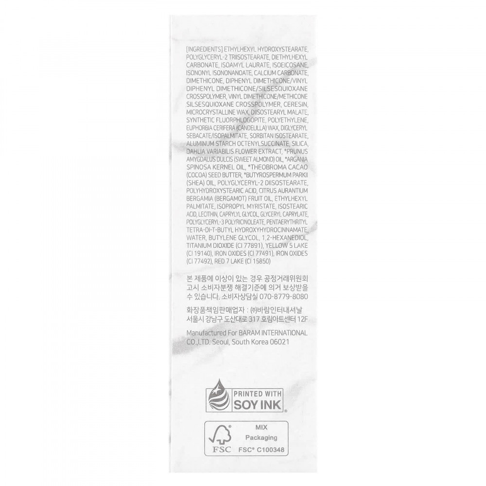 Этилгексил гидроксистеарат, полиглицерил-2 триизостеарат, диэтилгексилкарбонат, изоамил лаурат, изоэйкозан, изононил изононаноат, карбонат кальция, диметикон, кроссполимер дифенилдиметикона / винилдифенилдиметикона / силсесквиоксана, винил диметикон/метикон силсесквиоксан кроссполимер, церезин, микрокристаллический воск, диизостеарил малат, синтетический фторфлогопит, полиэтилен, канделильский воск (Euphorbia cerifera), диглицерил себацинат / изопальмитат, сорбитан изостеарат, алюминия крахмал октенилсукцинат, диоксид кремния, экстракт цветков георгина (Dahlia variabilis), масло сладкого миндаля (Prunus amygdalus dulcis), масло из косточек аргании (Argania spinosa), масло из семян какао (Theobroma), масло ши (Butyrospermum parkii), полиглицерил-2 диизостеарат, полигидроксистеариновая кислота, масло бергамота (Citrus aurantium bergamia), этилгексил пальмитат, изопропил миристат, изостеариновая кислота, лецитин, каприлилгликоль, глицерил каприлат, полиглицерил-3-полирицинолеат, пентаэритритил тетра-ди-трет-бутил гидроксигидроциннамат, бутиленгликоль, 1,2-гександиол, диоксид титана (CI 77891), краситель желтый 5 лак (CI 19140), оксиды железа (CI 77491), оксиды железа (CI 77492), красное озеро 7 (CI 15850).